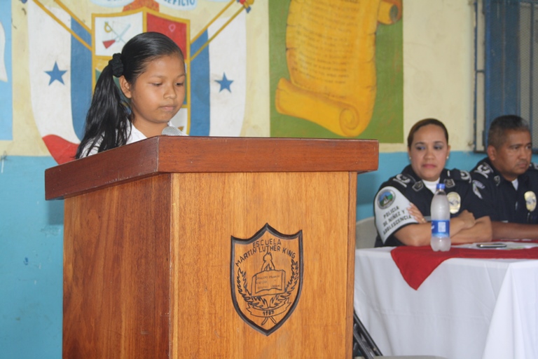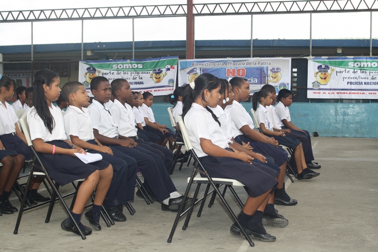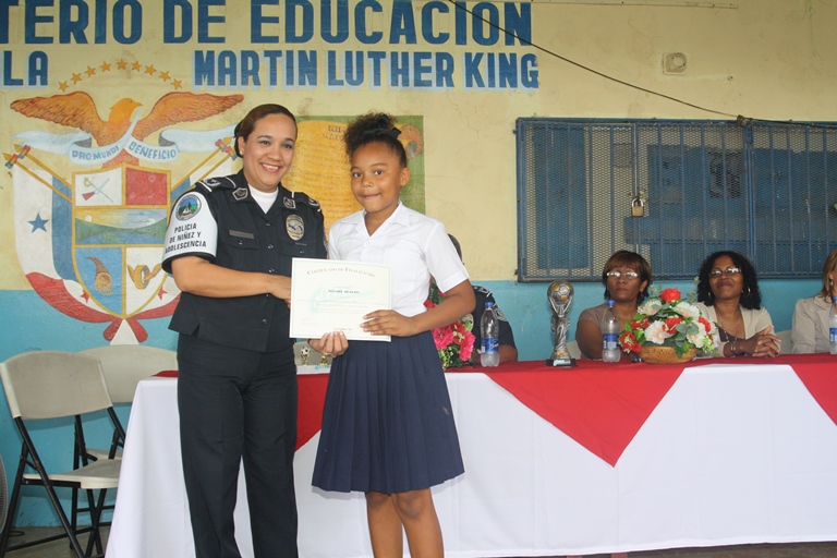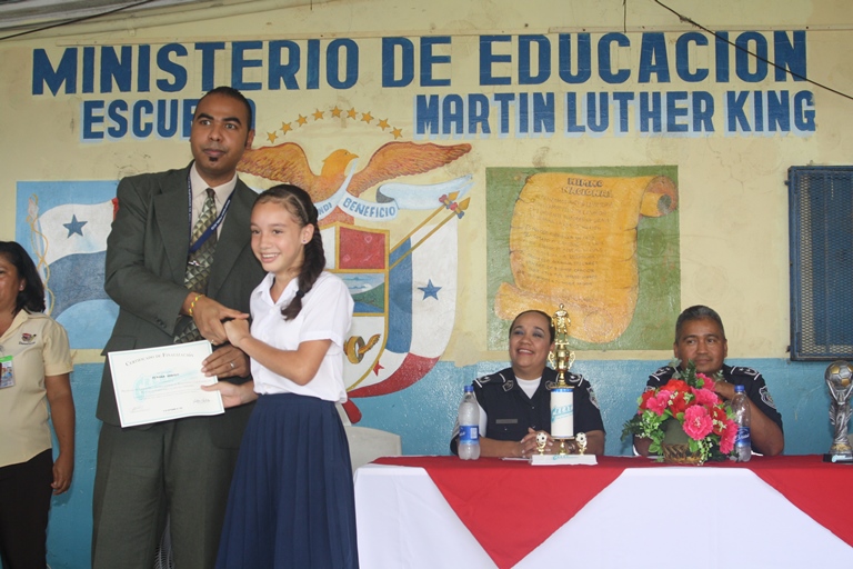 Más de 100 estudiantes de la escuela Martin Luther King, ubicada en Cerro Cocobolo del distrito de San Miguelito recibieron su certificado que los acredita como participantes del programa GREAT de resistencia a las pandillas y el abuso de alcohol y drogas. En el acto estuvieron presentes el Subcomisionado Quincleito Mora de la Zona de Policía de San Miguelito; la Mayor Alma Vega Jefe Encargado de la Policía de Niñez y Adolescencia; la Profesora Maritza Smith, Directora del mencionado plantel educativo, además de la Profesora Libertad Rivera, Supervisora Regional de Educación; la Licenciada Sophie Villamil, asistente de la Juez Penal de Adolescentes, el Licenciado Argo Hyman, asistente de la Fiscal Superior de Adolescente y la Señora Sahira Samaniego del Club de Padres de Familia de la escuela Martin Luther King. Al hacer uso de la palabra, el Subcomisionado Quincleito Mora, exhortó a los estudiantes para que se superen física, emocional e intelectualmente a fin de lograr sus metas profesionales y de esta manera salir ellos y sus familias hacia adelante, al igual que lo han hecho muchas personas de bajos recursos. En tanto la Profesora Maritza Smith agradeció la colaboración desinteresada de la Policía Nacional a través de este programa que ha sido recibido con beneplácito tanto por parte de los padres de familia, como de los estudiantes y el personal docente del plantel ya que este programa GREAT capacita a los estudiantes para que logren evitar ser reclutados por las pandillas y puedan rechazar las insinuaciones hacia el consumo de tabaco, licor o drogas. |