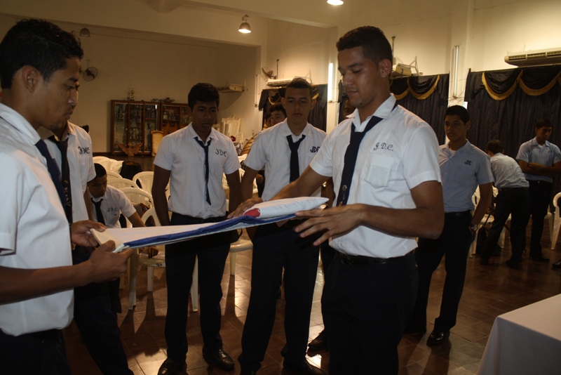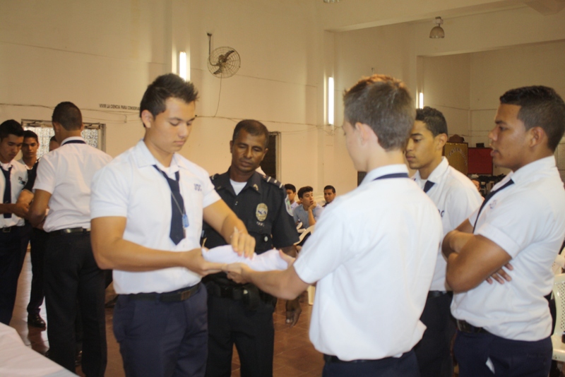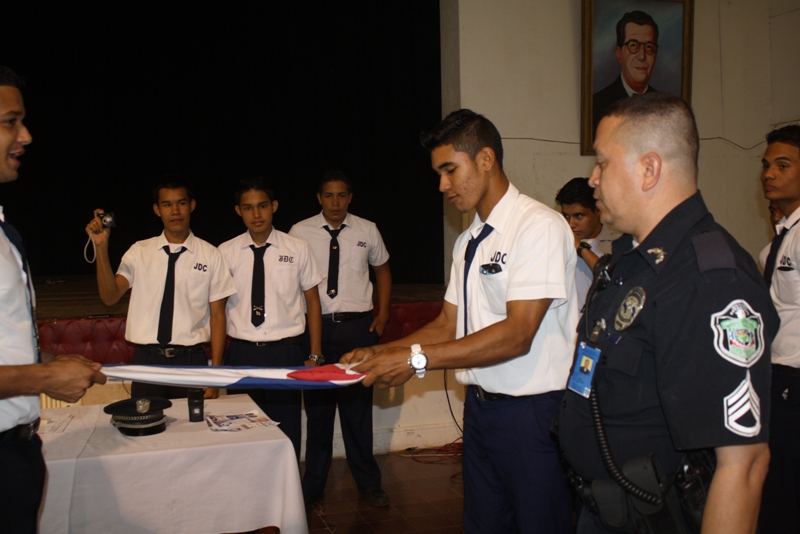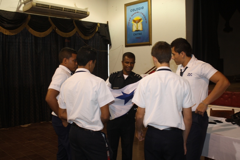 Estudiantes que conforman e integran el Batallón del colegio José Daniel Crespo que representará a Panamá en el Desfile de Las Rosa, el cual se realizará en Pasadena California, Estados Unidos recibieron instrucción de parte de unidades de la Zona de Policía de Herrera sobre la forma correcta de doblar, sostener y guardar nuestra insignia patria.