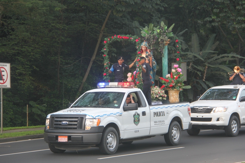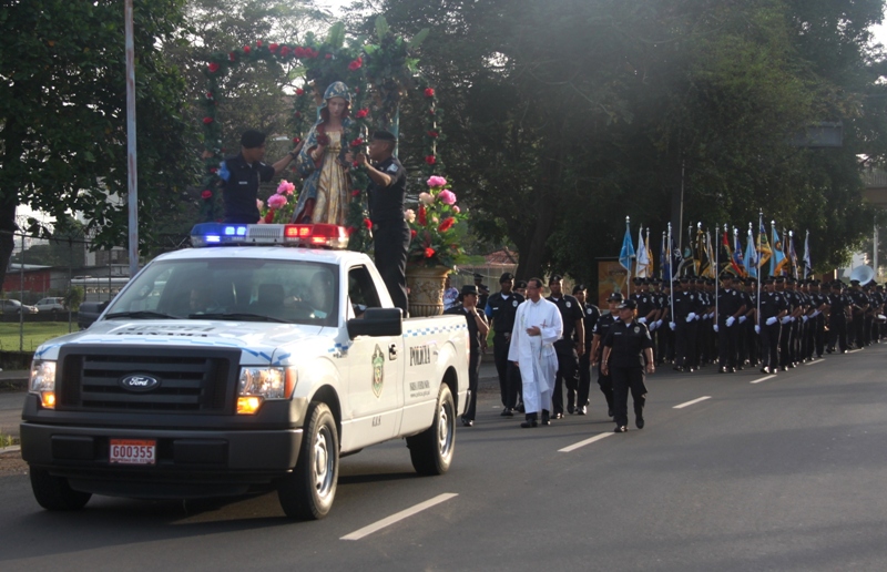 Uniformados y miembros no juramentados de la Policía Nacional recibieron con jubilo la visita de la imagen de la Santísima Virgen Santa María la Antigua, Patrona de la República de Panamá durante una emotiva ceremonia realizada durante el acto cívico en la sede de Ancón. El acto inició con una caravana en la que los guardias de honor escoltaron a la Santa Virgen hasta la sede policial, donde los feligreses tendrán la oportunidad de rendirle homenaje, demostrarle su fe y darle gracias por los favores recibidos. Posteriormente, se dio la bendición de la capilla San Miguel Arcángel de la Policía Nacional por parte del monseñor Pedro Joaquín Hernández Cantorero, obispo encargado de la Fuerza Pública. La solemnidad de Santa María la Antigua se une este año 2013 a la conmemoración de los 500 años de la Primera Diócesis en Tierra Firme en América. |