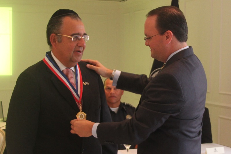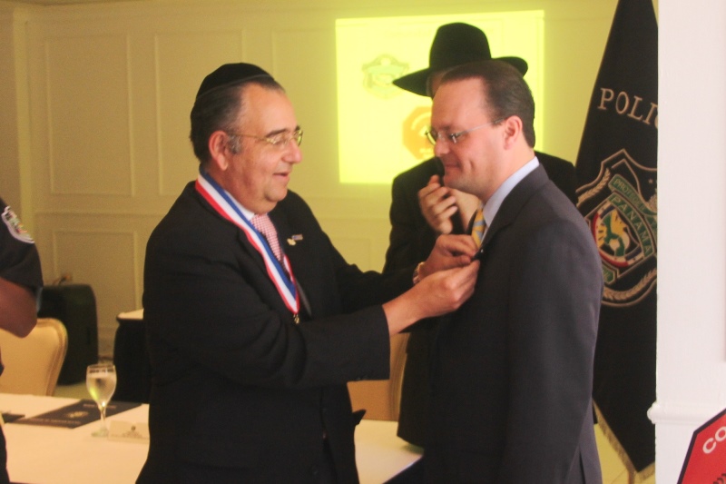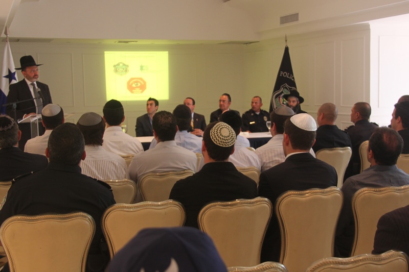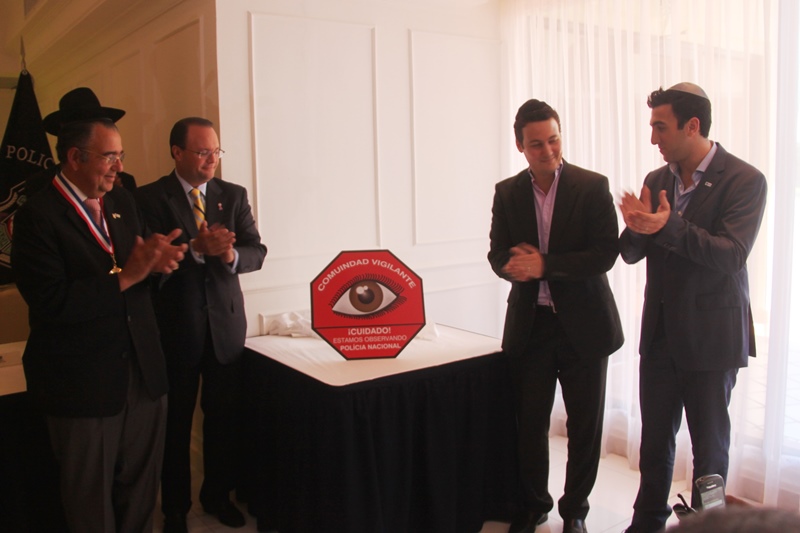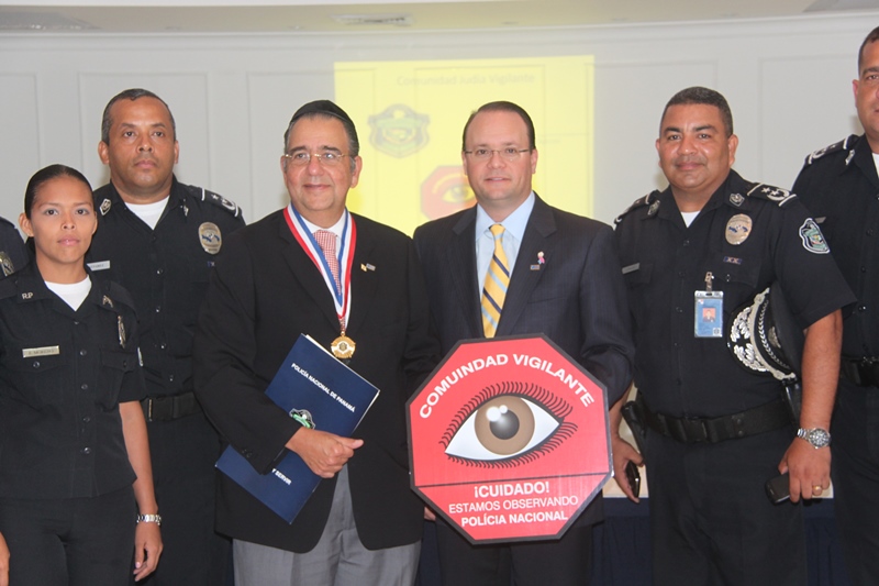 En medio de una ceremonia que se realizó en el Club Hebreo, la comunidad Judía de Panamá, inauguró el programa Judíos Vigilantes, en el marco de los programas de seguridad que implementa el Departamento de Seguridad Ciudadana de la Policía Nacional de Panamá. Este evento contó con la presencia del Director de la Policía Nacional de Panamá, Ingeniero Julio Moltó quien recordó que se trata de una labor conjunta entre las unidades policiales y la comunidad a fin de garantizar la vida, honra y bienes de la ciudadanía. En la mesa principal estuvieron sentados el Director de la Policía Julio Moltó, el señor David Moisés Hanono, Directivo de la comunidad judía de Panamá; el Rabino Aarón Lein, el Sr. Ezra Chabot, Directivo del Departamento de Seguridad Institucional, además del Rabino Isaac Sherem, así como el Comisionado Benjamín Sambrano, Jefe de la Policía Metropolitana. La Policía Nacional le hizo un reconocimiento al Sr. David Moisés Hanono por su invaluable aporte a la paz y el desarrollo de la sociedad panameña a quien se le entregó la Medalla al Servicio Distinguido y un pergamino de honor, en tanto la comunidad judía de Panamá, le entregó un pin, distintivo del Departamento de Seguridad al Director de la institución policial. En el marco de la actividad, se repartieron calcomanías de Vecinos Vigilantes que serán colocadas en las puertas de las residencias, comercios y escuelas de la comunidad Judía de Panamá. |