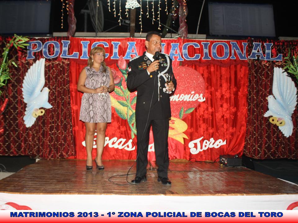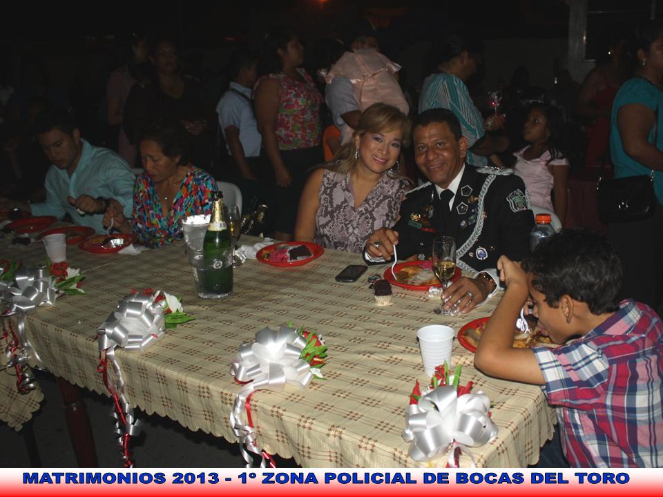 Este sábado 21 de diciembre, diez unidades de la 1º Zona Policial de Bocas del Toro, estuvieron contrayendo el santo sacramento del matrimonio en una gran ceremonia realizada en el patio principal de la estación policial de Changuinola. El Comisionado Javier Castillo y su esposa fueron los padrinos de los recién casados donde también se presentó el niño Josep Navarro, del programa de TVN Canta Conmigo, cantantes locales y el grupo Voces y Cuerdas de la Policía Nacional quienes también amenizaron el evento. En horas de la tarde, tres parejas católicas se casaron en la Iglesia Santa Isabel de Hungría en Changuinola mientras que el resto de las parejas en horas de la noche, fueron casadas por el Pastor Evangélico Juan Padilla de la Iglesia Cuadrangular. Fueron más de trecientos invitados entre ellos autoridades municipales y gubernamentales de la provincia. Con fuegos artificiales y una gran cena estilo bufete culminó el evento. El Comisionado Castillo en nombre del Señor director de la Policía Nacional Julio A. Moltó felicitó a las unidades recién casadas y manifestó seguir apoyando actividades similares que fortalecen el núcleo familiar. Entre los recién casados están: Muchas felicidades a todos.