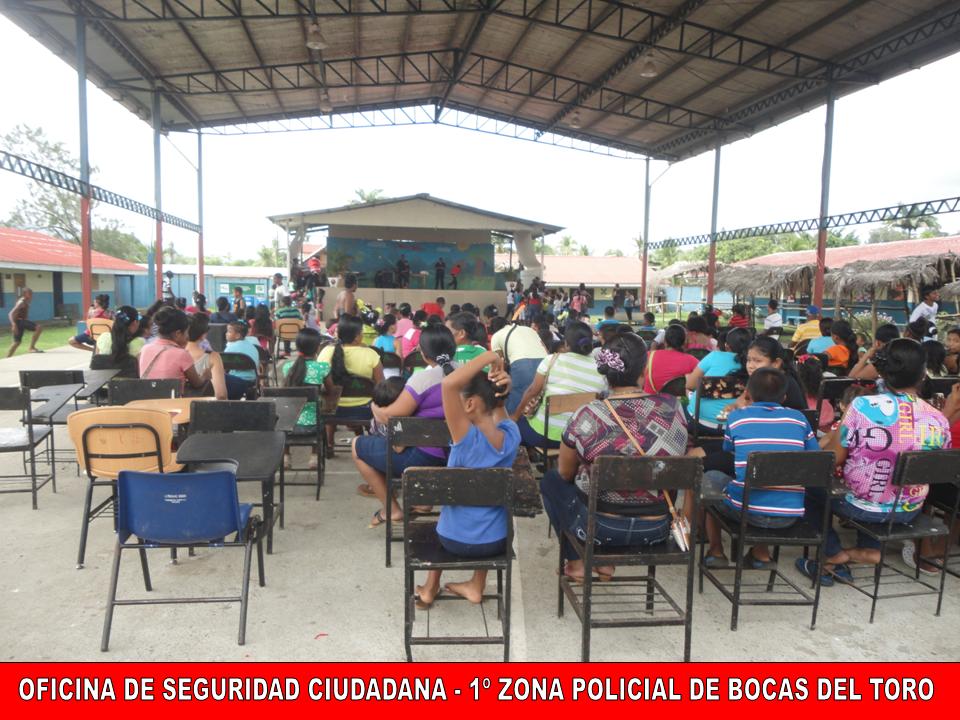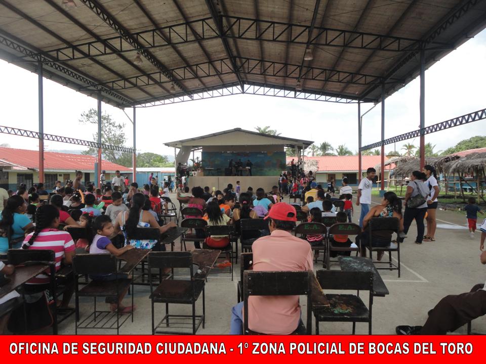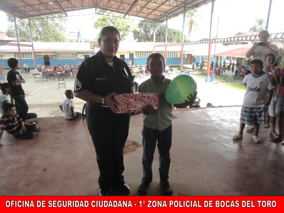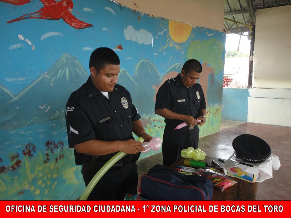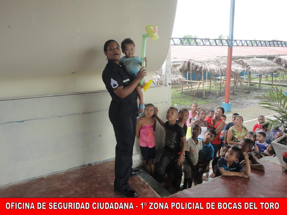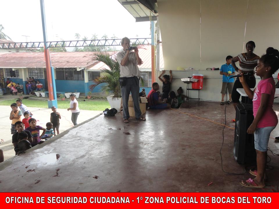 La Oficina de Seguridad Ciudadana de la 1º Zona Policial de Bocas del Toro, junto a padres de Familia de la Escuela Pública de Almirante organizó una pequeña fiesta de verano para niños y niñas de la comunidad. En la actividad se realizaron juegos tales como carreras de sacos, concurso de canto entre otras actividades las cuales divirtieron por más de tres horas a la niñez de Almirante. De igual forma, los niños recibieron figuras con globos, muchas golosinas y regalos. Fueron mas de cien niños los que participaron del encuentro el cual fue de mucho agrado para todos. |