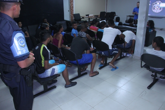 La confianza es importante para el fortalecimiento del crecimiento personal de cada individuo, es por ello que la Unidad Preventiva Comunitaria (UPC) de la Policía Nacional brindó una charla sobre la autoestima, dirigida a treinta y tres jóvenes y niños del barrio de Curundú. Esta actividad contó con el apoyo de especialistas del Ministerio de Desarrollo Social (Mides), quienes junto a los uniformados instruyeron de manera dinámica a los chicos en como tener confianza en sí mismos, para así cumplir sus metas; además se les reforzó el tema de los valores, como parte integral de su desenvolvimiento como individuos de bien para la sociedad. Cada valor será tratado por día en esta charla que se desarrollara por una semana. Con esta iniciativa la Policía Nacional tiene como objetivo velar por el bienestar de la juventud y niñez panameña, sembrando valores para un país en convivencia pacífica. |