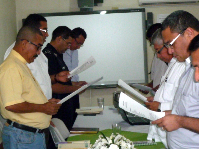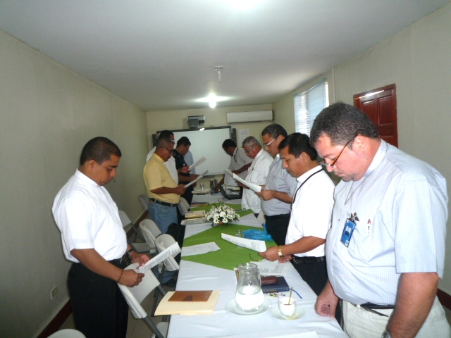 Los capellanes de la zona policial de Coclé, celebraron su reunión mensual, en la estación policial de Penonomé para rendir cuentas de sus actividades ante Monseñor Pedro Hernández, encargado de la Pastoral Policial de la Conferencia Episcopal Panameña y estableciendo sus metas y proyectos para el 2014. La Policía Nacional cuenta con 15 capellanes, distribuidos en toda la geografía nacional, quienes son el soporte espiritual de los agentes y personal no juramentado, que laboran en los distintos estamentos de esta institución de seguridad pública. Estos hombres de Dios, realizan misas, bautizos, matrimonios, charlas y toda una gama de actividades, para fortalecer la fe cristiana de nuestras unidades y cuando se requiere confortar a una de ellas, por la pérdida de un familiar, siempre están allí, guiando, orando y fortaleciendo al necesitado. En la actividad estuvo presente el Subcomisionado Nadím García, Jefe de la Segunda Zona Policial, quien sostuvo lo importante que es para sus unidades, contar con la guía espiritual de los pastores de la iglesia. |
