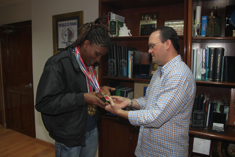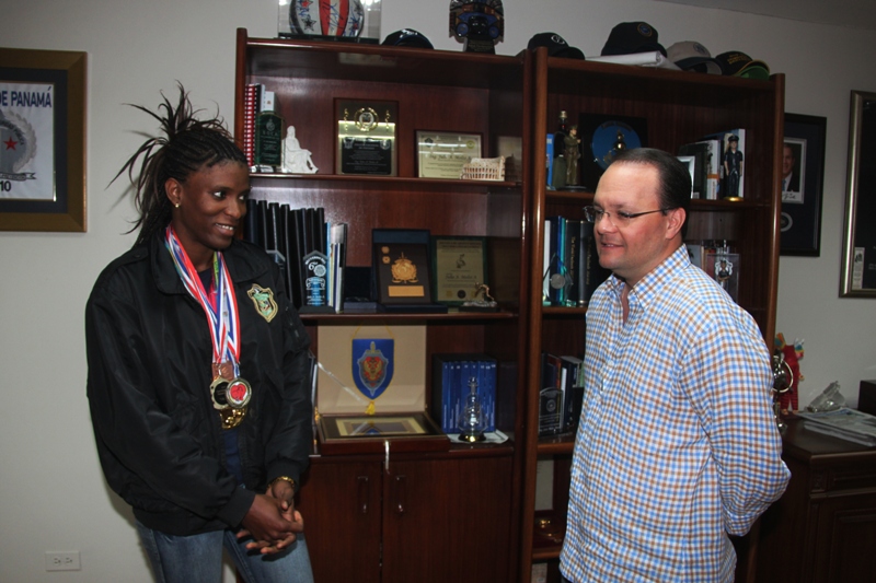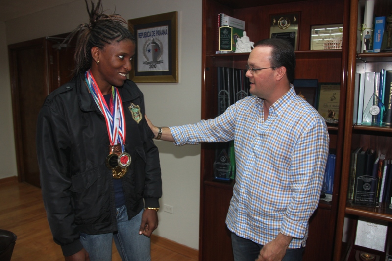 Como toda una campeona, fue recibida en el despacho superior la cabo segundo Atheyna Bylon; quien con orgullo le mostró al director de la Policía Nacional, ingeniero Julio Armando Moltó la medalla de oro que obtuvo en la categoría de los 75 kilogramos Peso Welter, durante laXXXI Copa Internacional de Boxeo Independencia Nacional celebrado en República Dominicana. El ingeniero Moltó le hizo entrega de bonos como un reconocimiento a su valioso aporte al boxeo nacional, expresando que "no solo ha sido un triunfo para la Policía Nacional, por contar entre sus filas con una talentosa deportista, sino también para todos los panameños, ya que deja en alto a nuestro país en estas importantes competencias en el mundo pugilístico". Para esta joven boxeadora, la fortaleza y disciplina adquiridas como policía, la han ayudado a seguir adelante, logrando un total de 8 medallas; 7 de ellas de oro y una de bronce. También el apoyo de sus compañeros uniformados ha sido fundamental en su preparación. Como ella misma nos comentó, fueron ellos los que descubrieron su potencial y la animaron a participar de los Guantes de Oro que cada año organiza la institución. Desde entonces, Atheyna se ha destacado en varias competencias internacionales, como Los Juegos Bolivarianos en Perú y Los Juegos Centroamericanos y del Caribe realizados en Costa Rica, ambos durante el 2013. Después de haber derrotado recientemente a la brasileña Flavia Figueiredo y sumar así otra presea de oro para Panamá, Atheyna Bylon no perderá un minuto para continuar su entrenamiento; están próximos los Suramericanos en Chile a celebrarse en marzo y Los Juegos Centroamericanos y del Caribe, programados para el mes de junio, en los que de seguro nos dejará en alto. Esta policía boxeadora exhortó al resto de las damas a atreverse a practicar esta disciplina, que junto a su función como uniformada le ha ayudado a crecer internamente como persona, a seguir sus sueños y la impulsa a superarse profesionalmente. FELICIDADES ATHEYNA BYLON, LA GRAN FAMILIA POLICIAL TE APOYA Y DESEA QUE SIGAS COSECHANDO MUCHOS EXITOS. FELICIDADES!