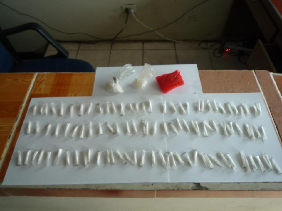 Unidades de la Pollicía Nacional, en Changuinola, de servicio en la Policía de Niñez y Adolescencia en Finca 6 recibieron una llamada telefónica en la que ciudadanos informaron que en la cancha sintética del sector se mantenían sujetos dedicándose a la venta de sustancias ilícitas. Al atender el llamado, unidades se presentaron al lugar y los sujetos desconocidos al notar la presencia policial en el punto se dieron a la fuga dejando abandonada una bolsa plástica transparente con 100 porciones de polvo blanco, que al parecer se trata de cocaína para la venta al detal. Adicional otra bolsa blanca con 3 gramos de polvo blanco. Todo este material fue puesto a órdenes del Ministerio Público de la provincia de Bocas del Toro. |