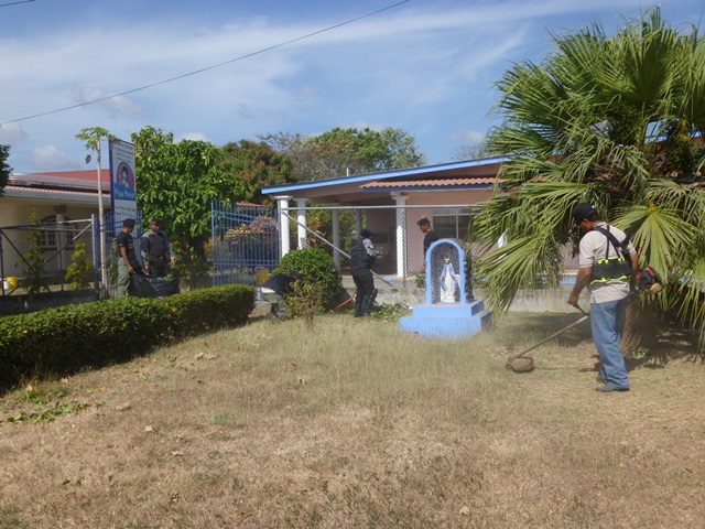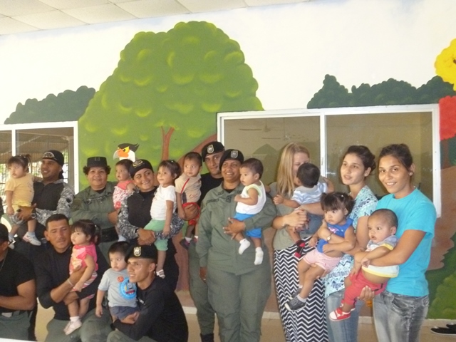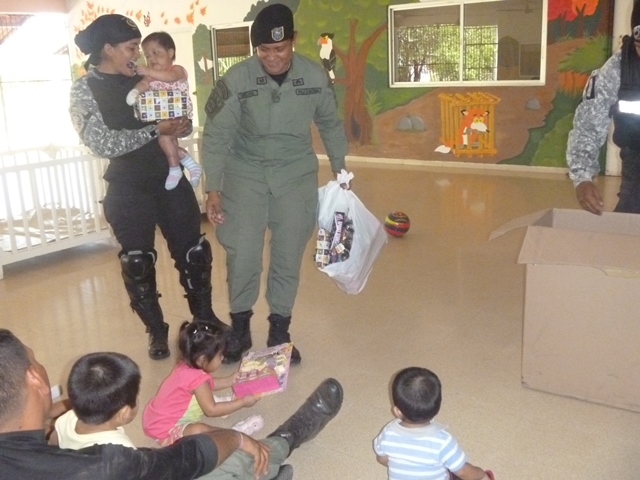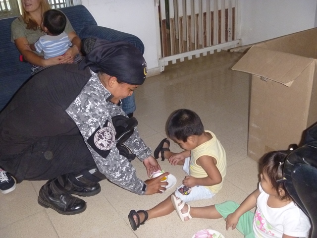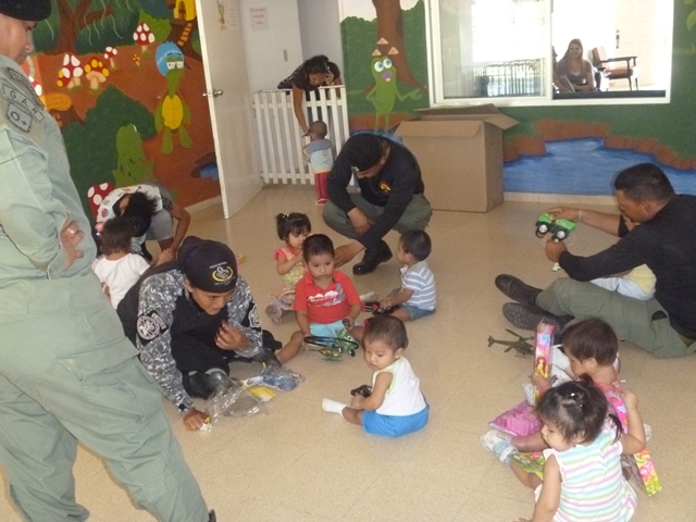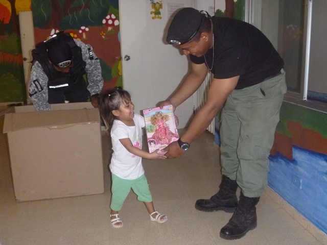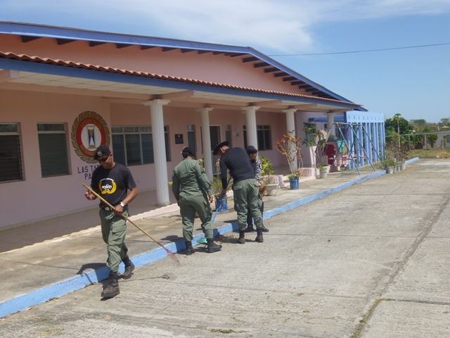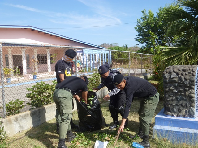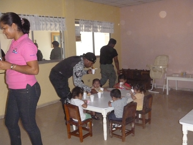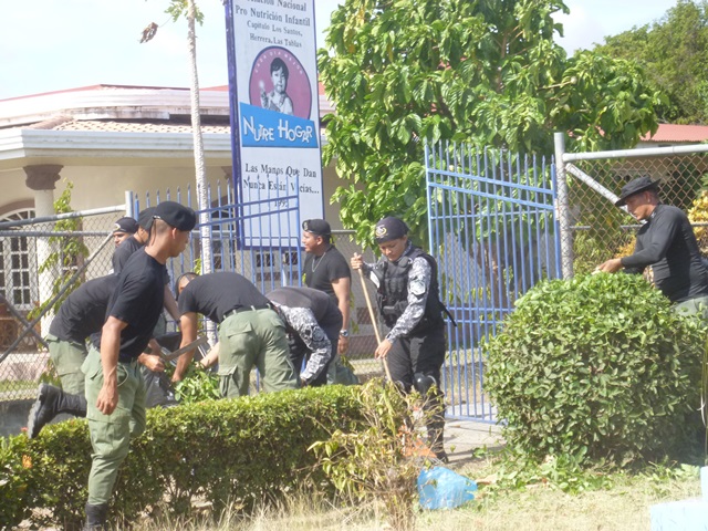 Unidades policiales que forman parte de grupo GAR Y LINCES de la 7ma Zona de Policía de Los Santos realizaron el día viernes 14 de marzo de una jornada de limpieza en Nutre Hogar. Las unidades policiales se formaron en grupo siendo su principal objetivo el apoyo con la limpieza de las áreas verdes de las instalaciones de Nutre Hogar - Las Tablas, pero a la vez llevaron alegría, sorpresas y golosinas a estos niños que en su gran mayoría son provenientes de las áreas comarcales del país, con un alto índice de desnutrición. Compartieron momentos de alegría con estos niños, donde cada unidad policial adoptó por un día a uno de los pequeñines del centro, quienes le hicieron entrega de regalos y muestras de cariño y afecto. Los colaboradores del centro dieron su agradecimiento, manifestando su alegría por tan humilde muestra por parte de la Policía Nacional con quien sabe que cuentan en todo momento. |
