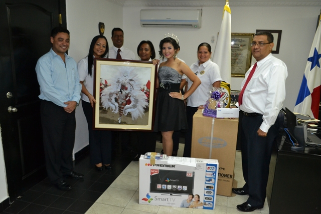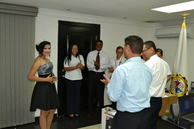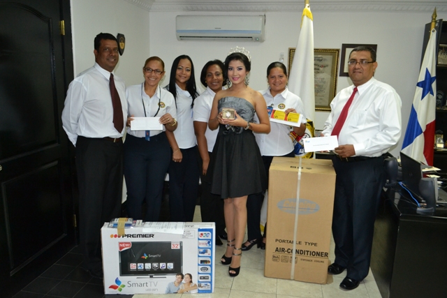 Tras la celebración de los alegres Policulecos de la Policía Nacional, la Dirección de Investigación Judicial hizo entrega de reconocimientos a su candidata quien obtuvo la corona de segunda princesa de este año. Jazmín Navarro quien representó orgullosamente a la DIJ el pasado 8 de marzo en los Policulecos 2014 realizados en los estacionamientos de la Ciudad Deportiva Irving Saladino, recibió reconocimientos por su notable participación y realce a la institución, por parte de la Dirección de Bienestar Policía y la Dirección de Investigación Judicial. Entre los regalos, Jazmín recibió: Un reloj Fossil, una estadía en Sheraton Bijao para dos personas (tres días y dos noches), dos certificados de regalos de vale Panamá por cincuenta balboa cada uno, un aire acondicionado portátil, un televisor plasma de 32 pulgadas. Adicional un celular Samsung S-4 y un cuadro enmarcado de la candidata con el vestido de fantasía que lució durante su presentación en la actividad. Los obsequios fueron entregados por el Comisionado Manuel castillo director de investigación judicial, el subcomisionado Miguel López subdirector de investigación judicial, el subcomisionado Flavio Vergara jefe del Departamento de Recursos de la DIJ y demás oficiales que formaron parte de la organización del evento. |