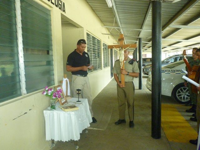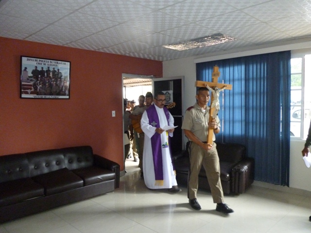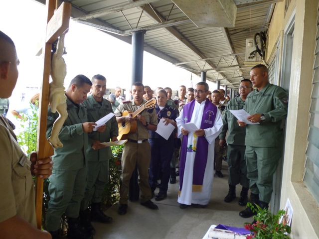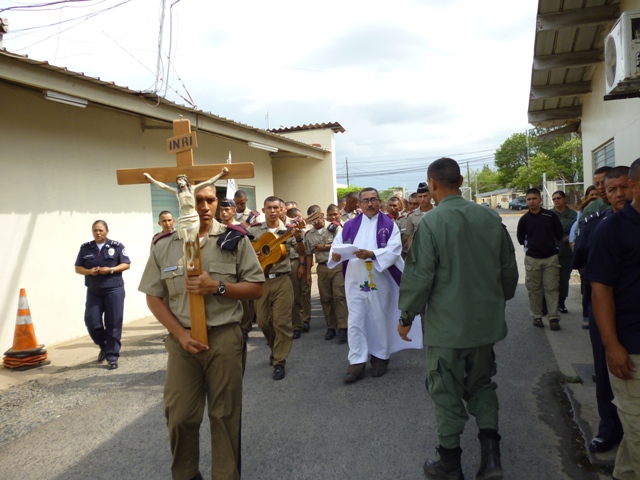Con un multitudinario fervor Ccatólico, a la Sagrada imagen peregrina del “Señor Jesús Nazareno”, revivió el episodio del vía crucis arquidiocesano en la Zona de Policía de Veraguas, recordándonos el doliente camino de Cristo con la cruz a cuestas hacia el Calvario. Como es tradición el recorrido penitencial con la sagrada y venerada imagen del “Señor Jesús Nazareno”, estuvo presidido por el padre Noel Pinzón capellán de esta zona, oficiales, clases, agentes, estudiantes de la ISPOL extensión Veraguas y personal no juramentado. La Vía dolorosa de las 14 estaciones o episodios de la pasión de Jesús, fueron acompañados con intensos momentos de contemplación, meditación, oración y canticos penitenciales animados. “Hermanos y hermanos, que nuestra mirada hacia la cruz sea sosegada y contemplativa, recordando al crucificado que no hizo alarde de su categoría de Dios, sino que tomó la condición de esclavo, para darle una palabra de aliento a cualquiera que sufra abatimiento por sus pecados. Acompañemos con mucha devoción la pasión de nuestro Señor Jesucristo”, invitó el capellán, al inicio de la procesión. Al final del Vía Crucis, se recordó hacer presente la pasión del señor, que nos enseña cómo el dolor puede salvar. Cristo no solamente sufrió y murió, sino que resucitó y por eso estamos todos aquí presentes. Él es un viviente, no está sujeto al tiempo ni al espacio, está en medio de nosotros. Nuestra fe vive, como ha dicho el Papa Francisco, la fe de la Iglesia es joven en el corazón de sus fieles, no interesa la edad, condición social, raza. |