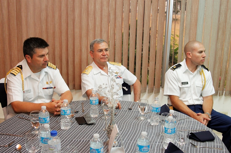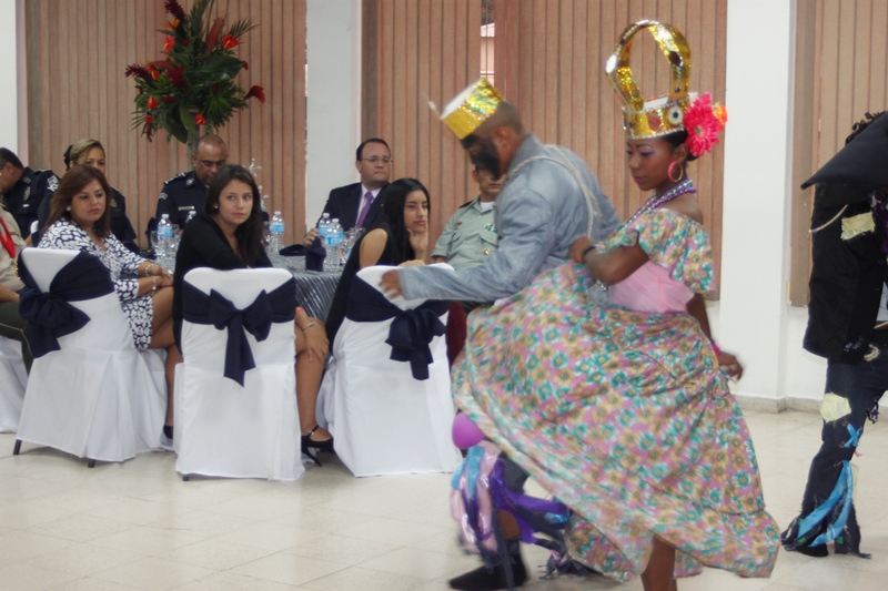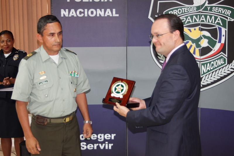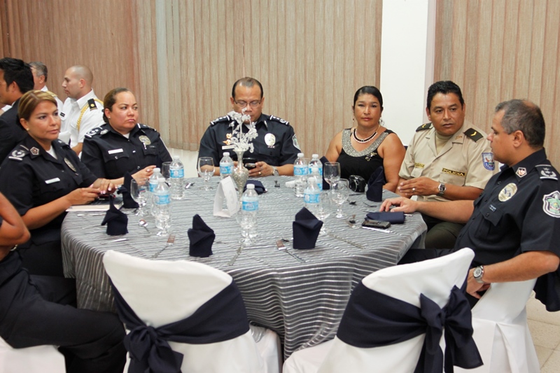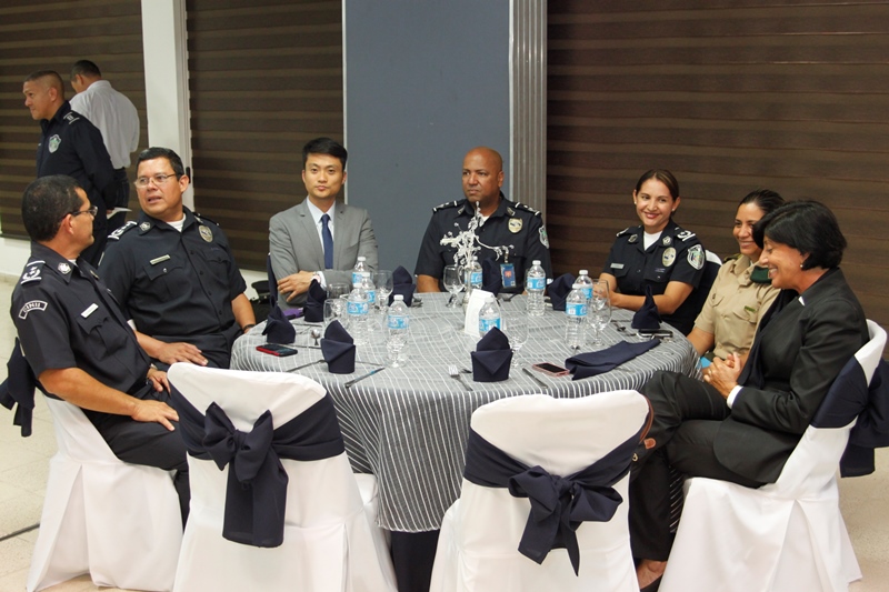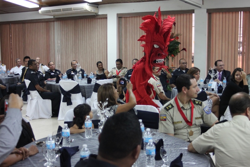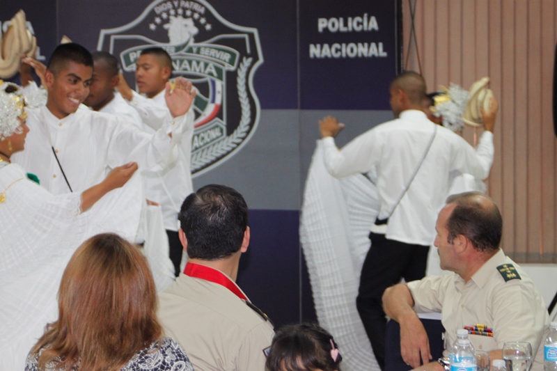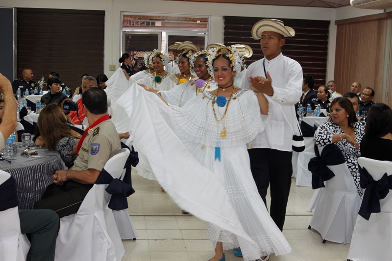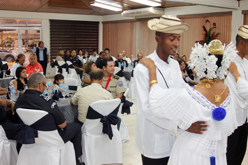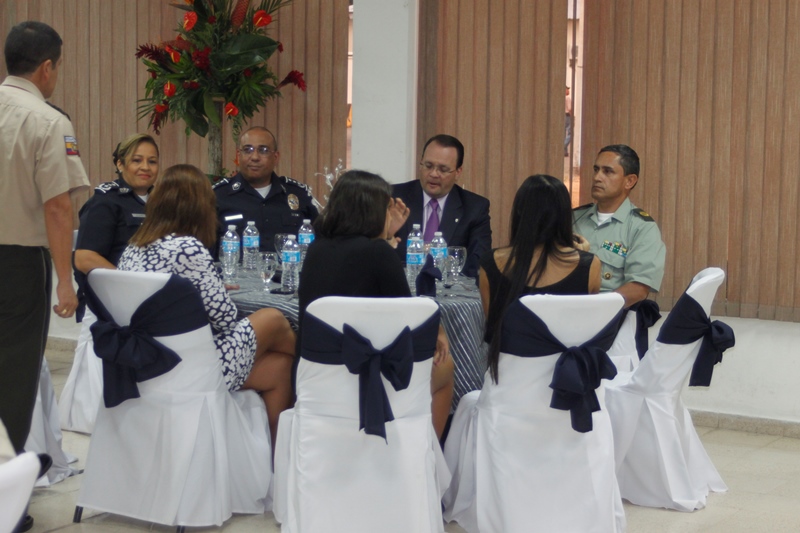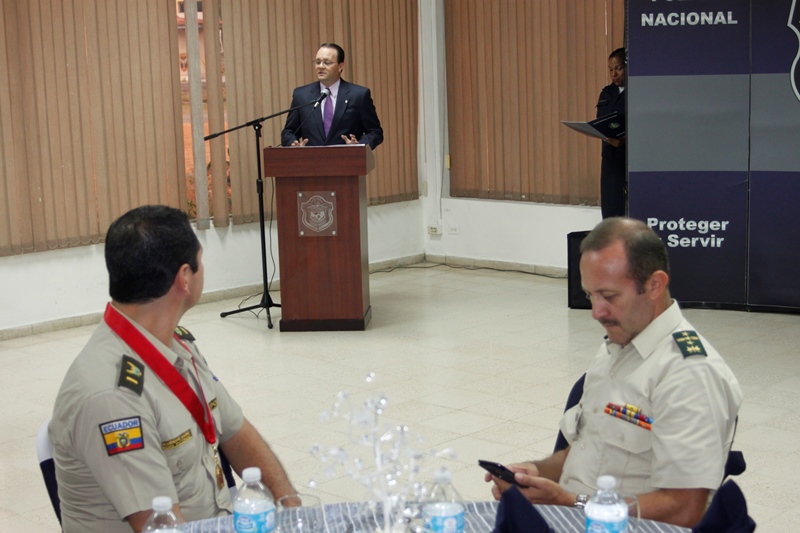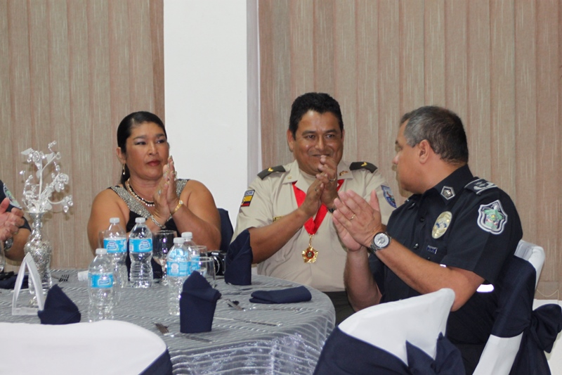 Oficiales de la Policía Nacional y de otros estamentos de seguridad del Estado se reunieron en la Sede policial de Ancón con el objetivo de condecorar a los Agregado Policiales de la Embajada de Ecuador en Panamá. Fue entregada la Medalla al Servicio Distinguido al Coronel Edgar Fernando Proaño Pazmiño, mayor Nelson Almendariz Sánchez y al sargento primero, Jaime Males, todos miembros de la Policía de Ecuador. Durante la ceremonia se compartieron experiencias y anécdotas junto a agregados militares, navales, aéreos y policiales, en un almuerzo institucional que ayuda a estrechar los lazos de amistad, cooperación y trabajo con el resto de los países de la región, que representan estos uniformados. En esta amena reunión fueron recibidos con las palabras de bienvenida y agradecimiento del director de la Policía Nacional, ingeniero Julio Moltò, quien estuvo acompañado por los miembros del Directorio Nacional. En su discurso el director Moltó, al igual que el coronel José Herrera Velandia, presidente de la Asociación de Militares, Navales, Aéreos y Policiales acreditados en Panamá resaltaron la excelente cooperación y labor conjunta que los une por la seguridad de la región latinoamericana. Los agregados policiales entregaron al Director General de la PN, un presente muy especial. Finalmente los asistentes pudiero disfrutar de bailes típicos ejecutados por conjuntos del CES, integrado en su totalidad por aspirantes a oficiales. |