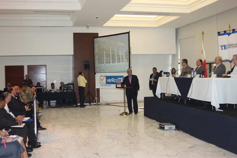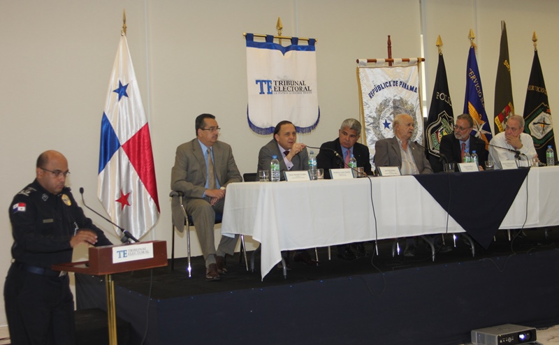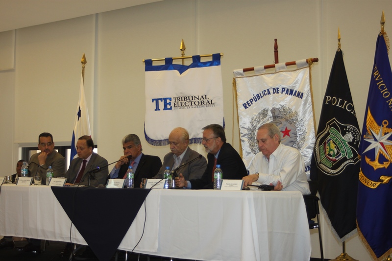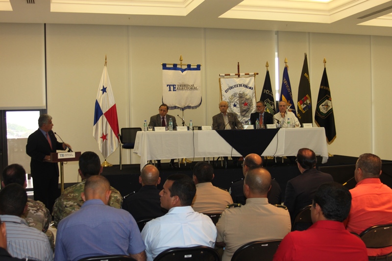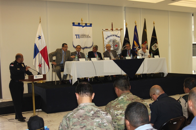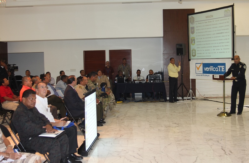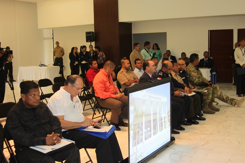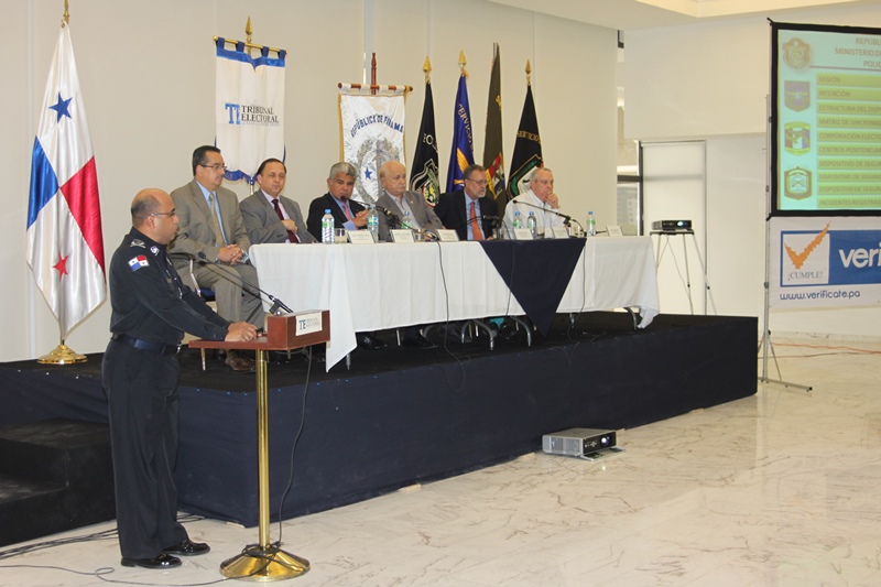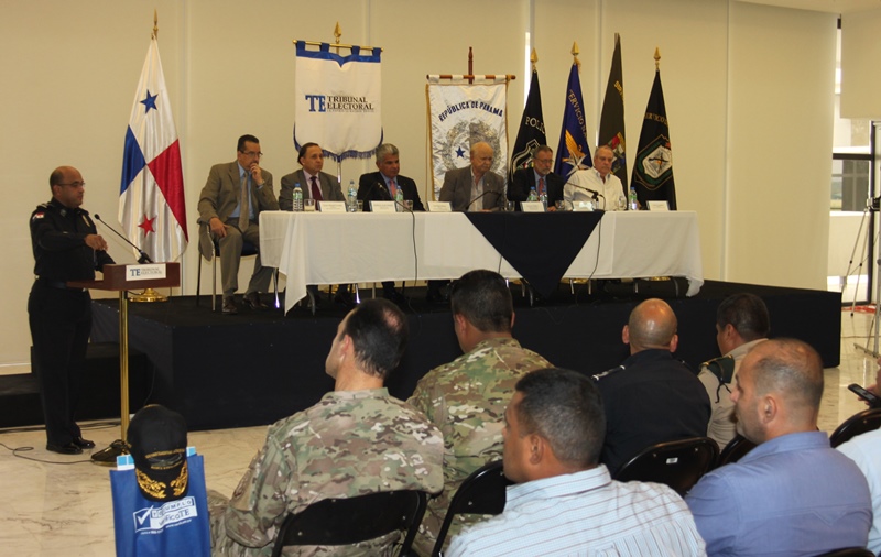 Los estamentos de seguridad del estado, presentaron ante los magistrados del Tribunal Electoral de la república de Panamá, las estrategias de seguridad para las próximas elecciones del presente año 2014. La presentación estuvo encabezada por el Ministro de Seguridad, José Raúl Mulino y contó con la participación del Director de la Policía Nacional Julio Armando Moltó; del Director del Servicio Nacional Aeronaval Comisionado Belsio González además de altos oficiales del Servicio Nacional de Fronteras y del Servicio de Protección Institucional. Correspondió al Comisionado Miguel García, Director Nacional de Operaciones de la Policía Nacional, explicar los detalles de seguridad ante los Magistrados Eduardo Valdés Escoffery, Erasmo Pinilla Castillero y Heriberto Araúz Sánchez, además del Lic. Fausto Fernández, Director del Cuerpo de Delegados del Tribunal Electoral y Víctor Manuel Cucalón Imbert, Jefe de la Junta Nacional de Escrutinios. Por su parte el Magistrado Eduardo Valdés Escoffery recordó la evolución y el papel de la Fuerza Pública en las elecciones anteriores y elogío su desempeño como garante de la seguridad en la Democracia en los sufragios electorales dentro de la república de Panamá. Igualmente se acordó el traspaso del mando de la Fuerza Pública al Tribunal Electoral, seis días antes de las elecciones, tal cual como lo establecen las leyes panameñas. |