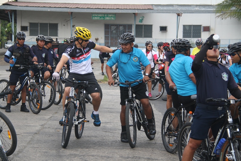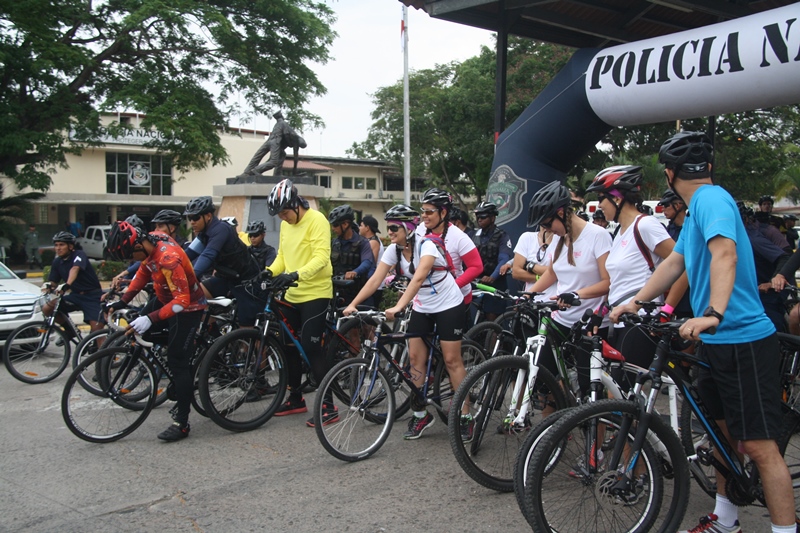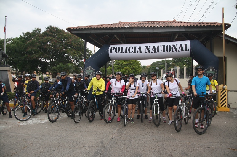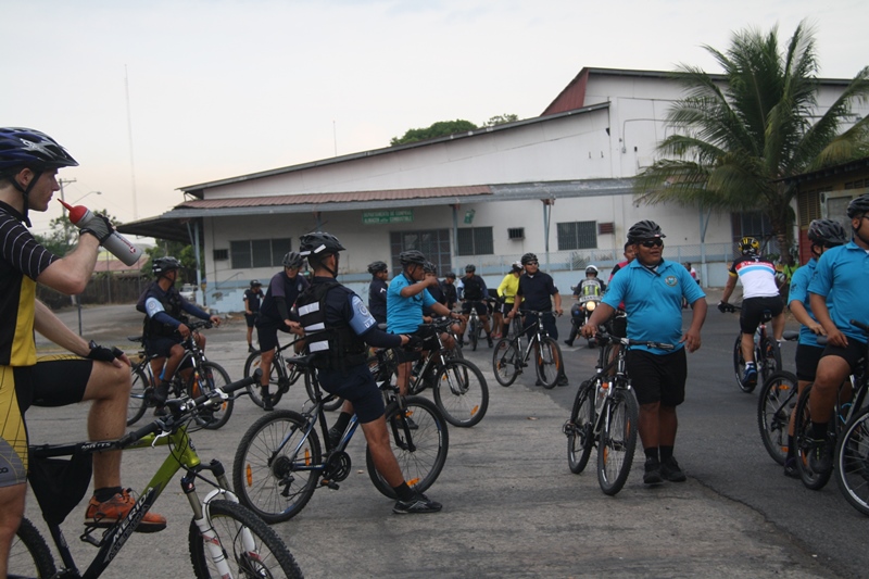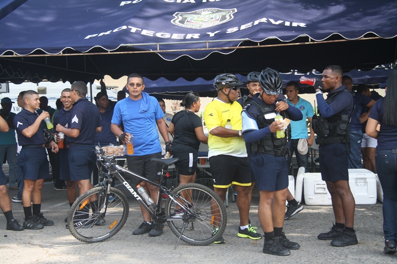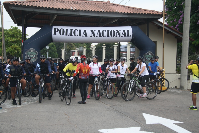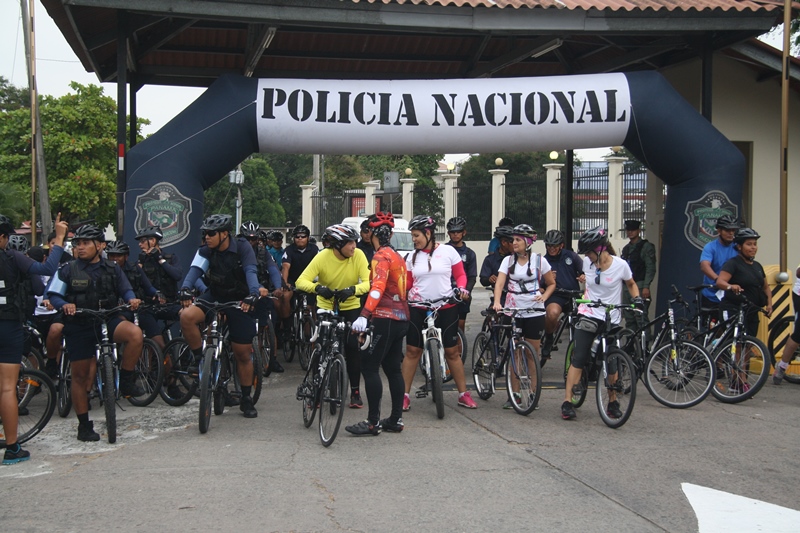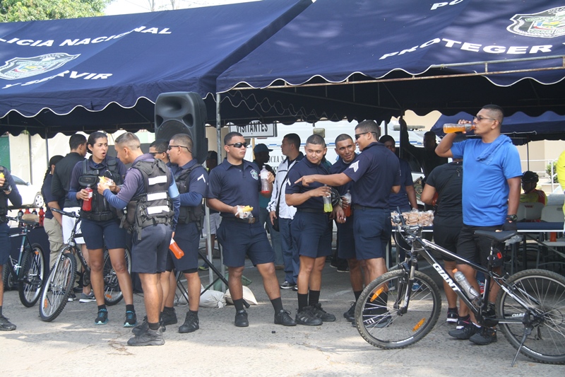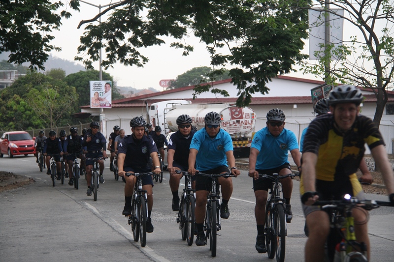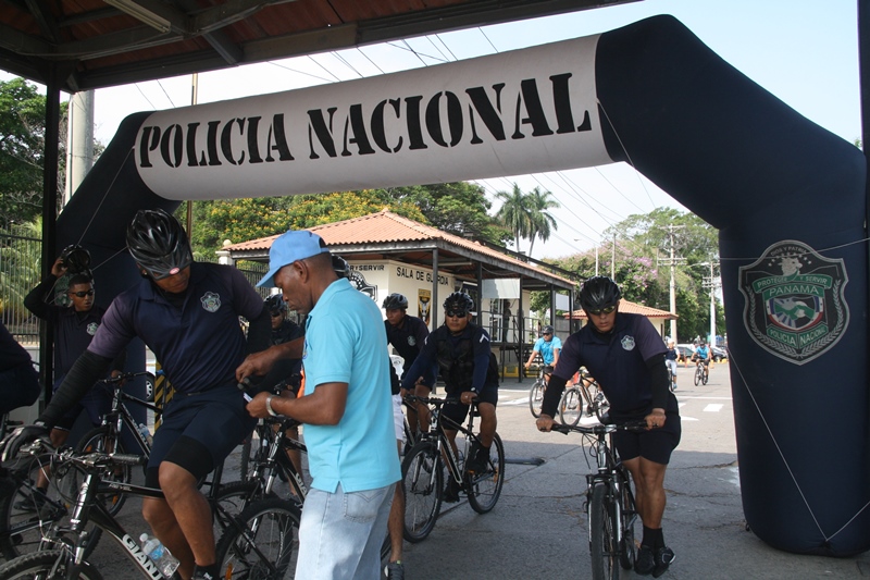 Un paseo ciclístico se realizó desde tempranas horas de este domingo 13 de abril, siendo parte de las actividades en celebración de los setenta y siete años (77) del Día del Policía. Los uniformados, algunos acompañados por sus hijos, se reunieron en la sede policial de Ancón desde donde partió la cicletada que tuvo como ruta la Ciudad del Saber en Clayton, Albrook y la Calzada de Amador. A su retorno a la sede policial, los ciclistas fueron recibidos con una alegre murga y disfrutaron de nutritivos emparedados, frutas y refrescos. Los asistentes también participaron de una tómbola, en la que se obsequiaron bicicletas y accesorios. El Comisionado Felipe Cruz, jefe de la Dirección Nacional de Armamento expresó que con esta actividad se busca ofrecer un rato ameno donde los uniformados compartan junto a sus compañeros, hijos y esposas, reforzando así los lazos familiares y la convivencia laboral. |