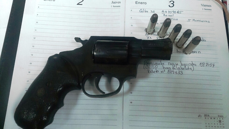 La Dirección Nacional de Operaciones de Tránsito cumpliendo con el lema “Proteger y Servir” a la ciudadanía realizaron puntos de control en diversos sectores de la ciudad. En uno de los puntos específicamente en el sector de Pan de Azúcar, unidades del Tránsito detuvieron a un vehículo Hyundai color Negro para solicitar la licencia al conductor, ya que se presumía estaba conduciendo bajo los efectos del alcohol. El Subteniente Ameth Vega de la Sección de Investigación de Operaciones de Tránsito procedió a realizar la verificación del sujeto encontrándole entre la pierna un arma de fuego específicamente un revolver calibre 38 cañón corto marca Rossi con cinco municiones en su cilindro sin detonar. Este sujeto fue trasladado a la Subestación de Policía Rolando Martínez para su trámite correspondiente debido a que el arma no portaba el permiso |