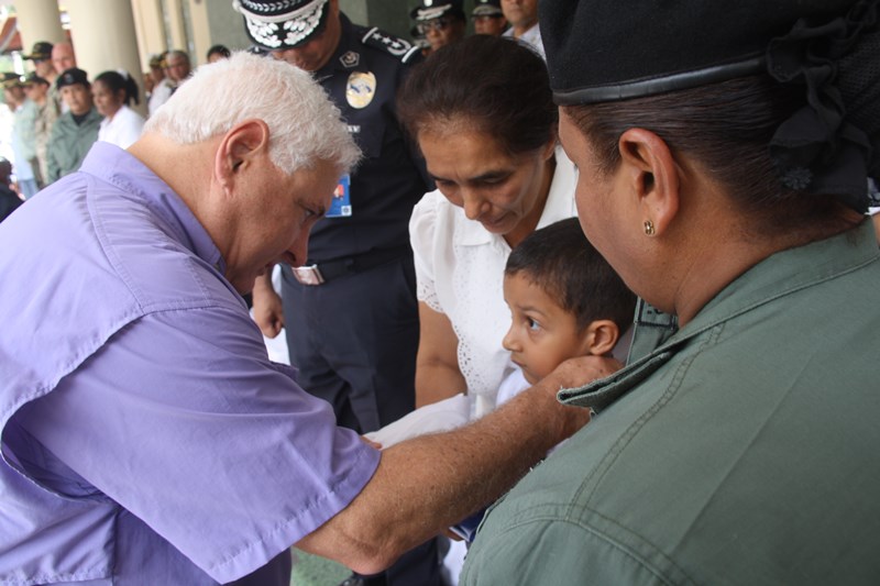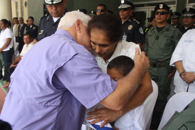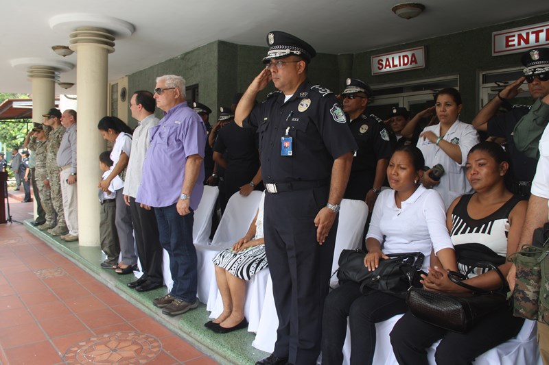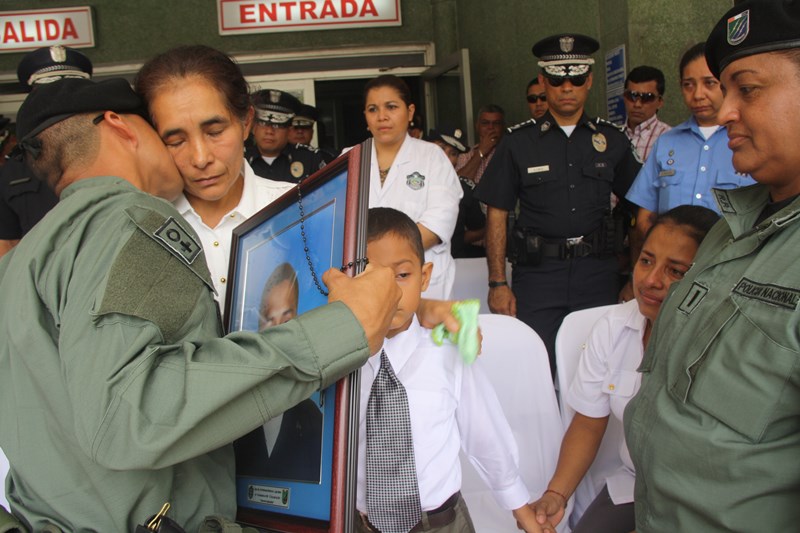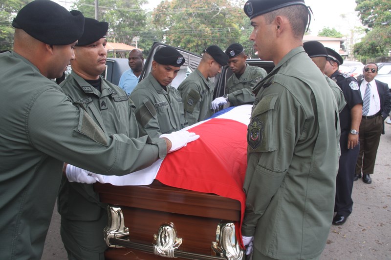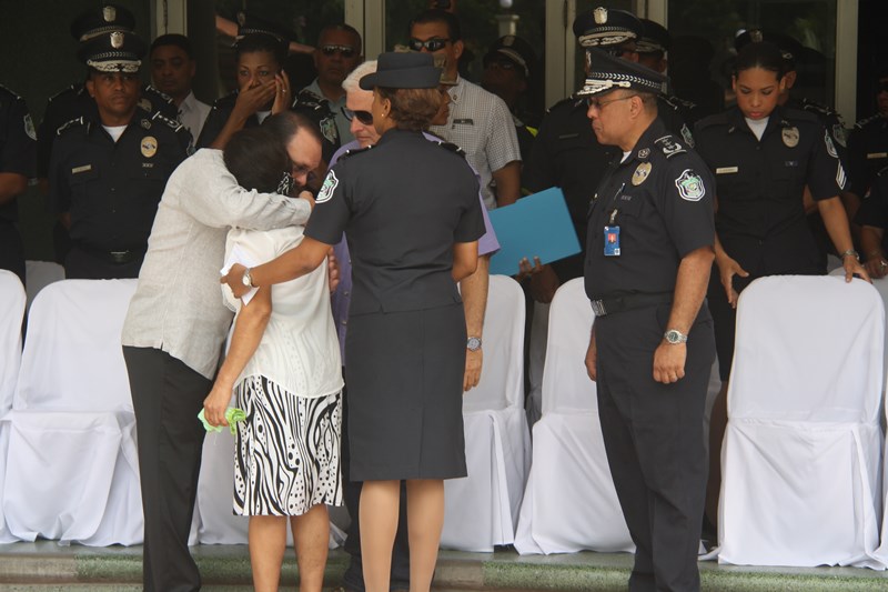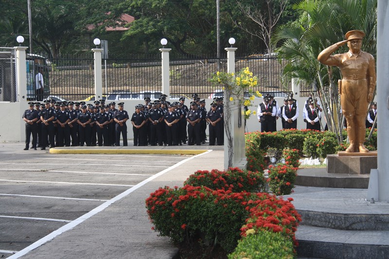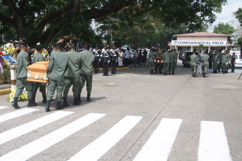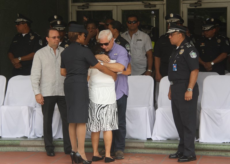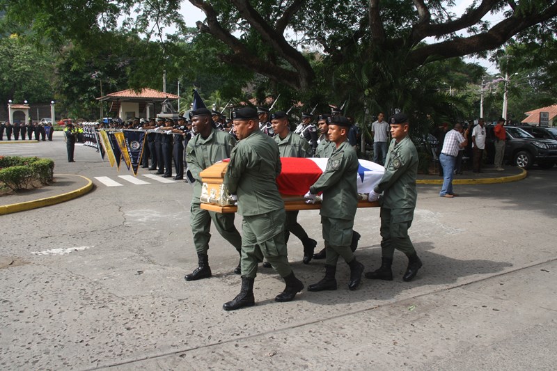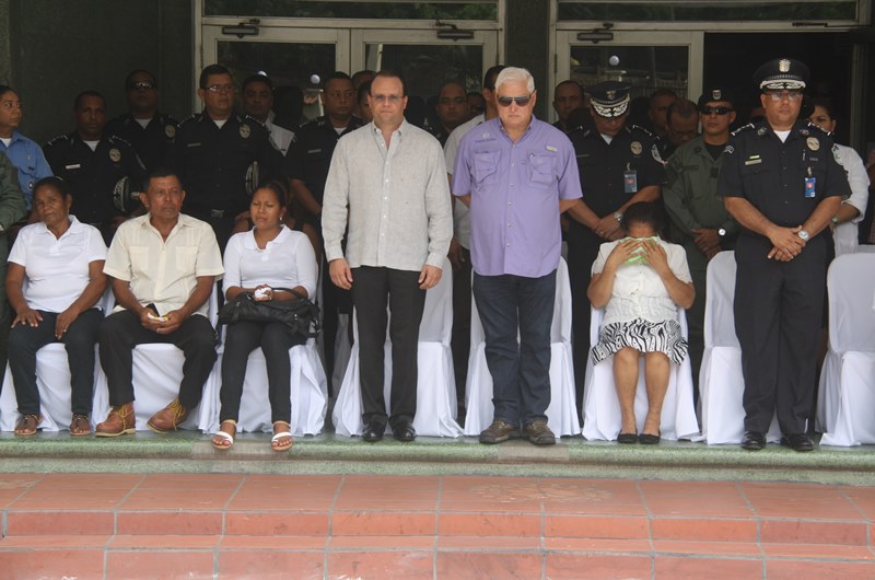 En una ceremonia de reconocimiento en memoria de quienes fueron nuestros compañeros, que trabajaron con nosotros y ofrendaron sus vidas en cumplimiento del deber, se rindió un homenaje al Sargento Segundo Post Mortem Alfredo López Marín, y el Cabo Segundo Post Mortem, Luís Lee, en la sede de la Policía Nacional en Ancón, ambos héroes perdieron la vida en la provincia de Colón. El homenaje dio inicio con la entrada de los féretros con los cuerpos de los policías caídos en el cumplimiento del deber, donde la familia uniformada, y demás estamentos de seguridad, como el Servicio Nacional Aeronaval y el Servicio de Protección Interinstitucional, entre otras autoridades, los recibieron con los honores correspondientes, en medio de escenas de dolor de parte de familiares y presentes. El reverendo padre Edgar Flores, Capellán de la Policía Nacional, elevó sus oraciones por los familiares de las víctimas para que tengan consuelo y se recuperen del dolor enorme que significa perder a un ser querido, más aún como consecuencia de un hecho violento. “Es una experiencia de profunda tristeza, no sé porque hay gente tan desalmada” dijo el reverendo padre quien antes de finalizar resaltó la labor de los policías, “es un trabajo que implica riesgo, y responsabilidades y acto seguido les roció agua bendita a ambos féretros. El director de la Policía Nacional, Julio Armando Moltó, mostró sus condolencias a familiares, “estos son los momentos más difíciles que he tenido que atravesar desde mi llegada a la Policía Nacional”, “es una pérdida irreparable para la institución, es un dolor que nada de lo que haga o diga les va devolver la vida a sus familiares”. "Estas muertes no serán en vano puntualizó. El mandatario de la nación, Ricardo Martinelli, quien acompañó a la familia uniformada y familiares de los fallecidos, sostuvo que “este hecho tan lamentable solo Dios sabe porque pasan”, es muy doloroso dejar madre, esposa e hijos” en medio de sus palabras solicitó al director de la Policía Nacional, que los nombres de estos héroes sean recordados a través de una fundación o becas. Una vez se dio el toque de silencio y salvas de honor se procedió a la lectura de las resoluciones de duelo, instante donde las unidades procedieron al dobles de las banderas, seguidamente la entrega de resoluciones de duelo y quepis a familiares, la entrega de la bandera nacional representa la profunda gratitud a estas unidades por haber protegido y servido con lealtad a la ciudadanía a su país aún a costa de su propia vida. Las señoras Agudela Marín, madre del Sargento Segundo Post Mortem Alfredo López Marín, y Sixta Aguilar, madre Cabo Segundo Post Mortem, Luís Lee, recibieron de manos del Presidente de la República y el Director de la Policía las banderas y los quepis. El oficio religioso se realizó ante la mirada y presencia del Presidente de la República, Ricardo Martinelli, el director general de la Policía Nacional, Julio Moltó, jefes de zonas, jefes de los demás estamentos de seguridad, entre otras personalidades quienes rindieron honores a los compañero, paz a sus almas y fuerza a sus familiares en tan dolorosa pérdida.