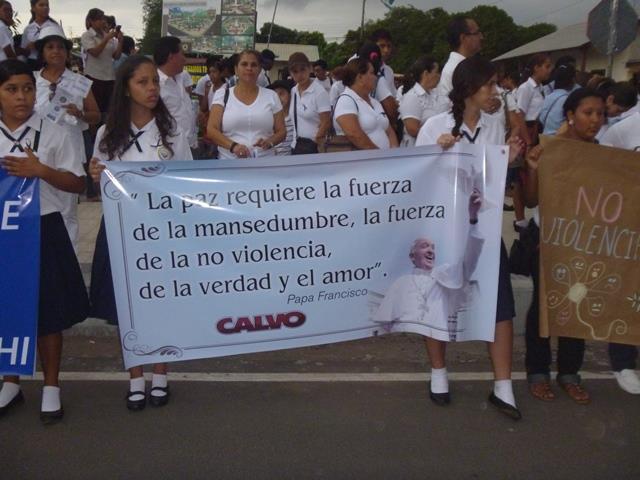 Una caminata por la paz y la tranquilidad de los residentes de la provincia de Herrera, realizaron estudiantes y personal administrativo del colegio secundario Padre Segundo Familiar Cano, de Monagrillo. La caminata se realizó con el propósito de rechazar la muerte violenta de dos educadores y que regrese la paz y la tranquilidad al distrito de Chitré. En la actividad además de los docentes y estudiantes participaron miembros de la Zona de Policía de Herrera y la comunidad civil para que no se registre este tipo de hechos que llenan de luto y dolor a familias de la provincia. |
