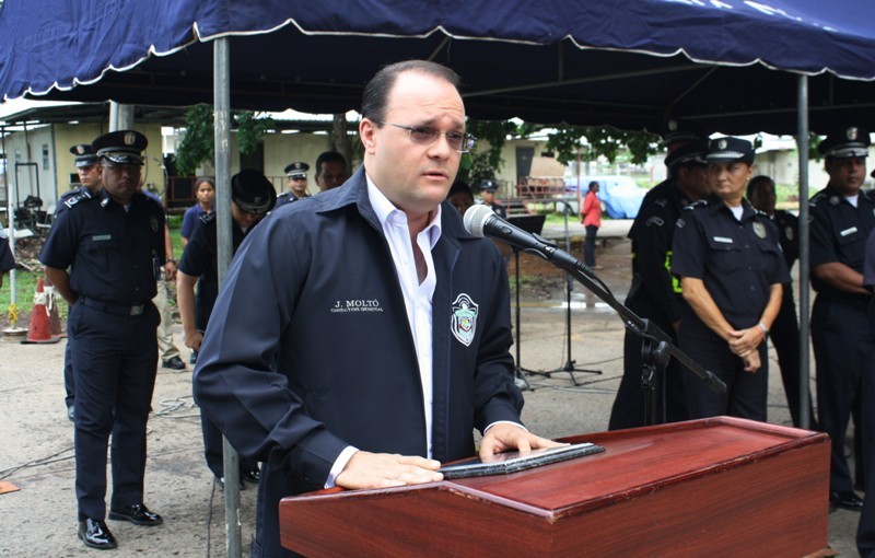 En una significativa ceremonia, la Banda de Música del Departamento de Seguridad Ciudadana le rindieron un homenaje al director de la Policía Nacional, Julio Armando Moltó por el apoyo brindado durante su gestión. Durante el acto en el que se apreciaron bellas interpretaciones de la Banda de Música y de la Banda de Guerra de la Policía Nacional, se le hizo entrega al jefe policial del Clarín y Banderín de Honor; además como un bello recuerdo, se le obsequió un cuadro con la foto de la primera presentación que se realizó en Albrook Mall bajo su administración. Por su parte, el Comisionado Bolívar Lasso recibió de manos del ing. Moltó una placa de reconocimiento por la labor realizada al mando del Departamento de Seguridad Ciudadana, a la vez que le agradeció el apoyo brindado. "Satisfecho y contento por la excelente labor de acercamiento que realiza Seguridad Ciudadana con la comunidad", así dijo sentirse el ingeniero Moltó al dirigirse a los uniformados que conforman este departamento y a los miembros del Directorio Nacional Policial, presentes. Trabajo que ha contribuido al fortalecimiento de los lazos con la comunidad, integrándola como un equipo a los esfuerzos que realiza la Policía Nacional por garantizar seguridad en las barriadas y calles, mediante los programas de Vecinos Vigilantes, entre otros.