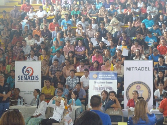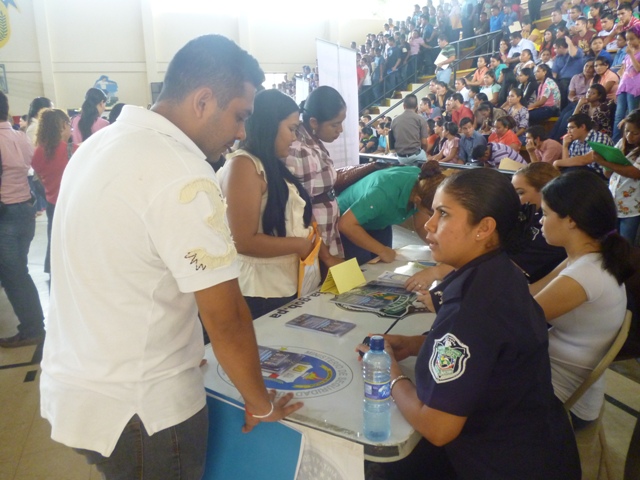 Unidades del Departamento de Selección y Reclutamiento de la zona policial de Veraguas, participaron en la primera Feria de Empleo del 2014, coordinada por el Ministerio de trabajo y Desarrollo Laboral (Mitradel) de esta provincia. Unas 52 empresas entre privadas e instituciones públicas, ofrecieron 500 plazas de empleos a más de los 3,000 Veragüenses que se dieron cita en el gimnasio de la escuela Juan Demóstenes Arosemena. En el evento la Policía Nacional, recibió un reconocimiento por parte de la viceministra de Mitradel, Sulphy Santamaría quien agradeció la participación de la entidad de seguridad. |