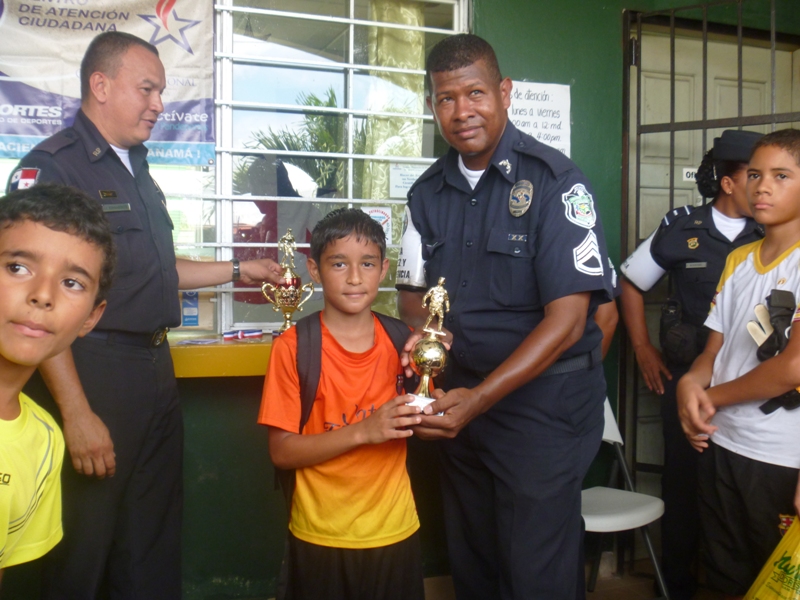 Un cardiaco partido de fútbol protagonizaron estudiantes que conforman los programas Dare y Great de la Policía Nacional. Esto se llevó a cabo el jueves 28 de agosto, en el complejo deportivo José Napoleón Franco. Este encuentro tuvo como objetivo alejar a los jóvenes de las pandillas y propiciar un acercamiento entre los estudiantes de distintos centros educativos. El tercer lugar se lo disputaron los equipos de V de año del colegio Stela Sierra y la escuela La Polvareda, quienes ganaron 1 a 0. El segundo puesto, fue para los integrantes del plantel Leónidas Delgado, quienes les ganaron al "team" del VI año del centro educativo Stela Sierra. Y el primer lugar, se lo llevó la escuela La Polvareda al vencer 2 a 0 al Leónidas Delgado. Luego de esta jornada emocionante, se realizó la premiación que contó con la asistencia de los oficiales de la Zona de Policía de Arraiján, unidades de la Niñez y Adolescencia, docentes y padres de familia. |