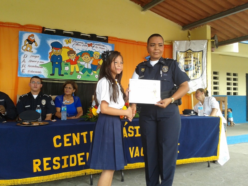 “Ya sé como decir no a las drogas y a la violencia, gracias a la orientación de los Policía de Niñez y Adolescencia”, manifestó la niña Cielo Gómez del VA de la Escuela Residencial Vacamonte de Vista Alegre, al culminar su capacitación en el programa Para Resistir al Uso de Drogas y Violencia (DARE). La ceremonia de finalización del curso, fue presidida por el Subcomisionado Luis Navarro, Jefe de la Zona de Policía de Arraiján, quien con frases de motivación instó a los 160 niños y niñas en poner en práctica los conocimientos adquiridos durante tres meses, no sólo en la escuela, sino también entre sus vecinos y amigos. Los niños expresaron su alegría con interpretaciones típicas y dramatizaciones, propias del programa. Posteriormente se hizo entrega de los diplomas. Durante el mes de agosto, 564 estudiantes de cinco centros educativos recibieron sus certificados DARE Y GREAT. |
