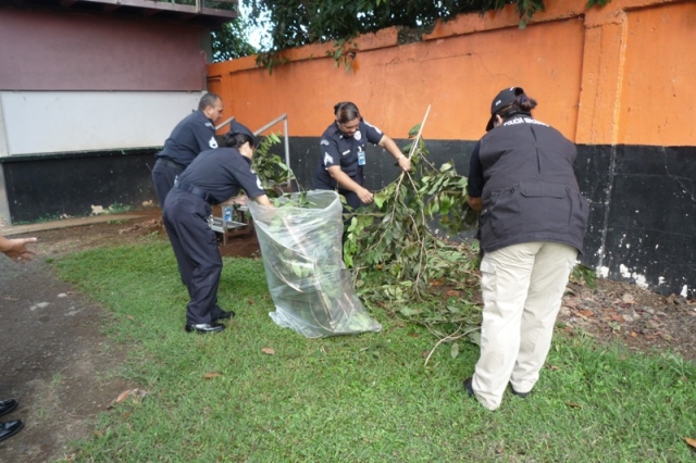 Unidades de la zona policial de la provincia de Los Santos, realizaron una jornada de limpieza en los estadios Olmedo Solé y Carmelo Cedeño, en conjunto con funcionarios del Municipio del distrito de Las Tablas. Desde muy temprano iniciaron con la recolección de basura en ambos estadios y en un lote baldío, que es utilizado por jóvenes de la urbanización Los Díaz, como centro de recreación en las tardes. Finalizado el trabajo, el subcomisionado Frank Pinilla, jefe de la zona policial, se reunió con el alcalde Noé Iván Herrera y el director de Pandeportes, para coordinar otras actividades. Además de devolverle a la comunidad espacios públicos para que los jóvenes y niños practiquen deportes, también se busca crear conciencia sobre la importancia de cuidar las instalaciones e incentivar el ornato y aseo. |