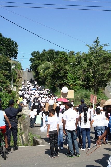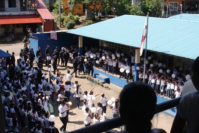 Con una marcha por las calles cercanas a la escuela Arnulfo Arias ubicada en Altos de la Torres, sector de Samaria en el distrito de San Miguelito, más de 500 estudiantes proclamaron la paz desde tempranas horas del martes 9 de septiembre. En el recorrido, los estudiantes portaron pancartas alusivas a los valores éticos, en medio de música de liras y tambores. La actividad estaba encabezada por el subcomisionado Raymundo Barroso, quien dirige la Unidad Preventiva Comunitaria de la Policía Nacional en el área de Samaria. Uno de los logros de esta actividad fue la inclusión de los vecinos de la comunidad “Altos de la Torres”, quienes presenciaron la sobresaliente iniciativa hecha realidad, gracias al apoyo de los profesores de la escuela Arnulfo Arias. Los estudiantes de esta escuela, entonaron cánticos tales como “Panamá para Cristo”, una vez iniciado los actos protocolares posterior a la marcha. En tanto, el subcomisionado Raymundo Barroso agradeció a los presentes la concurrencia al evento, mientras que los asistentes aplaudían y gritaban como muestra de cariño. Con esta acción policial, la Policía Nacional busca integrar a la comunidad de “Altos de la Torre” al programa “Barrios Seguros”.