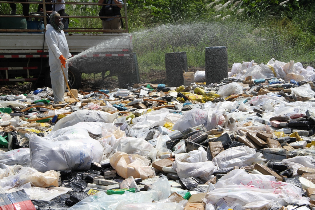La Dirección de Investigación Judicial (DIJ) de la Policía Nacional, destruyó esta mañana 7,2 toneladas de sustancias ilícitas, en el vertedero de basura ubicado en Cerro patacón. “La quema de estos narcóticos corresponde a las incautaciones efectuadas por los diferentes estamentos de seguridad del Estado desde el mes julio a mediados del mes de septiembre”, indició el capitán de la DIJ Bernardo Aguilar. Detalles por tipo de droga destruida el día de hoy: Durante este año, la Policía Nacional ha destruido más de 26 toneladas de sustancias ilícitas, en quemas realizadas en los meses de enero, abril, julio y septiembre. Esta diligencia contó con la participación de Farmacias y Drogas del Ministerio de Salud, el Instituto de Análisis de la Universidad de Panamá, así como el Instituto de Medicina legal (laboratorio de drogas) y la Fiscalía de Drogas, tal como lo establece la Ley 23 de 1986. Los Estamentos de Seguridad del Estado continúan su lucha contra el narcotráfico y el crimen organizado, a través de la implementación de nuevas estrategias y el fortalecimiento de acciones operativas dirigidas a combatir este flagelo y a obtener más barrios seguros. |