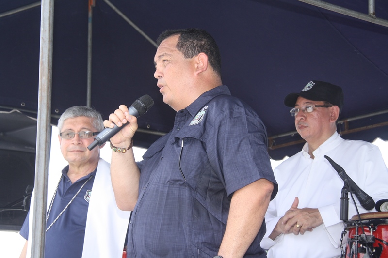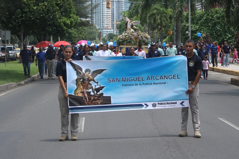 Con una misa televisada seguida de una procesión, la Policía Nacional de Panamá inició los actos en honor a la imagen de su patrono San Miguel Arcángel realizados en la mañana de este domingo 28 de septiembre en la Parroquia Santa Marta del Dorado, ubicada en la barriada Altos del Chase. La misa televisada fue presidida por el Obispo Pedro Hernández, encargado de la Pastoral de la Fuerza Pública y el Vicariato de la provincia del Darién. En esta actividad estuvo presente el Director de la Policía Nacional Omar Pinzón, además de los miembros del Directorio Policial y familiares. Tras analizar la situación que enfrenta la Fuerza Pública en las calles y barrios de nuestro país, que incluyen la comisión de delitos, el obispo Hernández reconoció que vivimos en una sociedad enferma, que le falta valores y que ha perdido el horizonte de Dios. Igualmente le recordó a los padres de familia de todo el país, que el adolescente sin criterio, anda buscando algo que le haga sentir que él es importante en la vida y si no lo encuentra dentro de la familia, lo busca afuera. Recomendó invertir el tiempo con sus hijos y escuchar sus realidades, haciendo sentir que son importantes, recordando una parábola donde hay un hijo que dice que no va y sí va, y un segundo hijo que dice que sí va y luego no va. "Estas son realidades que vivimos a diario", comentó el Obispo Pedro Hernández. En tanto la procesión de la imagen de San Miguel Arcángel fue trasladada sobre un anda, y salió a las 11:00 a.m. de los estacionamientos de los edificios administrativos de la Cinta Costera, para culminar frente al mirador del rompe olas ubicado detrás del Mercado del Marisco, lugar donde posteriormente se dio inicio a una feria familiar. En la actividad participó personal de las diversas direcciones de la Policía Nacional que vestidos con pantalón jeans y suéteres de diversos colores, llevaron globos, banners, y otros elementos alusivos a este acto. Es importante resaltar que la imagen de San Miguel Arcángel es el patrón de las Fuerzas Armadas y Policiales a nivel mundial, siendo adoptado en este caso como patrón de la Policía Nacional de Panamá. |