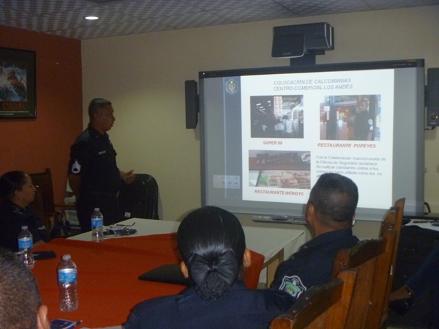Unidades que laboran en las distintas zonas policiales, se reunieron en la provincia de Veraguas con la comisionada Elsa Garzón, Directora Nacional de Gestión y Proyectos de la Policía Nacional. Durante la reunión, las unidades policiales expusieron sus proyectos y los métodos. Se aprovechó la presencia de la comisionada Garzón, para colocar calcomanía en los establecimiento comerciales participantes del programa de beneficios empresarial, el cual le brinda descuentos en compras y servicios a los miembros de la Fuerza Pública. La comisionada Garzón, le expresó su agradecimiento a los propietarios de estos establecimientos por el apoyo brindado a los miembros de la Policía Nacional. "Las unidades de la Policía Nacional en Veraguas están agradecidas por los beneficios que otorga la tarjeta de descuentos a los uniformados", resaltó Garzón. |