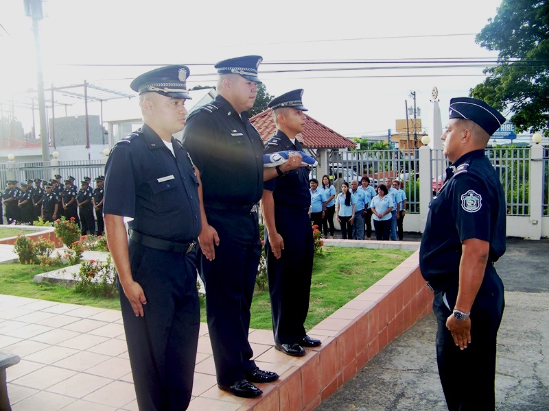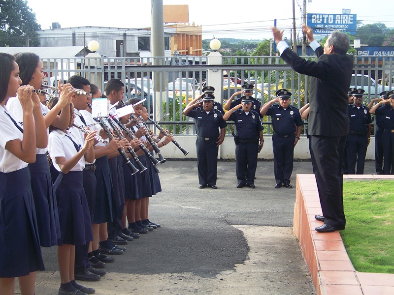 Jóvenes estudiantes del colegio Pedro Pablo Sánchez del distrito de La Chorrera, participaron en el acto cívico realizado en las instalaciones de esta sede policial, como parte de la tarea de acercamiento que realiza la Policía Nacional. El jefe de la zona policial comisionado Nadim García T. en compañía de los ofíciales, clases, agentes y personal no juramentado, participaron en el saludo a la bandera. De igual manera el comisionado García agradeció al profesor Virgilio Escala por la participación y deleite de las piezas entonadas por la banda de música de este colegio, exhortándolos para que sigan con sus estudios y en el futuro sean profesionales y personas de bien. Finalizado el acto cívico, se les brindó un desayuno a los invitados. |