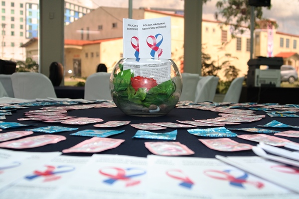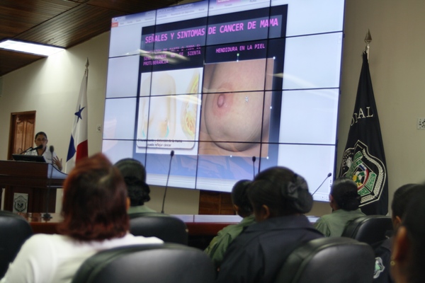 En marco a la celebración del mes de la “Cinta Rosada y Celeste” como símbolo de la prevención del cáncer de mama y próstata, miembros juramentados y no juramentados de la Policía Nacional, recibieron este lunes 13 de octubre de 2014, una charla sobre cómo evitar esta enfermedad. A través del Despacho de la Primera Dama de la República, Lorena Castillo de Varela, la Dirección de Bienestar Policial y Familiar, continúa con la programación a nivel nacional de docencia de prevención del cáncer de mama y próstata. |