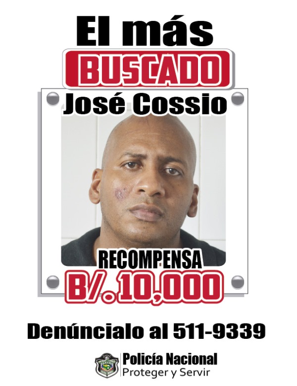 Si sabes dónde está, denúncialo. Se trata de José Cossio, un peligroso antisocial que el pasado 28 de septiembre de 2014, se escapó de la cárcel La Joya. Por él se ofrece una recompensa de 10 mil dólares a las personas que brinden detalles sobre su paradero o alguna pista que permita su recaptura. Para este fin, la Policía Nacional habilitó el número de teléfono 511-9339 en la Dirección Nacional de Inteligencia Policial. A Cossio se le asoció al hurto de 2.5 millones de dólares del Banco Internacional Comercial Bank of China, en la Zona Libre de Colón. Esto ocurrió el 15 de agosto de 2005. En esa oportunidad, se solicitó el llamamiento a juicio a José Cossio, de 41 años de edad, quien fue condenado a seis años de prisión. Historial 1- Es señalado por tumbe de drogas, tráfico internacional de drogas, homicidio, robo agravado, tráfico de drogas y posesión ilícita de arma de fuego. 2- El 22 de octubre de 2007, la Fiscalía 4ta. Superior de Panamá, emite oficio contra él, por el delito contra la vida y la integridad personal. 3- En el 2010, es detenido en los Estados Unidos, porque estar vinculado a un caso de drogas, en el distrito de Florida. Fue condenado a 72 meses de prisión por el delito de posesión con intención de distribución de cocaína tentativa y asociación ilícita. 4- El 3 de diciembre de 2011, es capturado por el delito de homicidio. Era requerido por la Fiscalía Auxiliar de Panamá. 5- El 9 de julio de 2014, se le vincula al decomiso de 191 kilos de cocaína, en Villa Zaíta, Alcalde Díaz. 6- El 15 de julio de 2014, ingresa al pabellón “1GD” del Centro Penitenciario La Joya, por órdenes de la Fiscalía de Drogas. 7- El 28 de septiembre de 2014, se fuga del Centro Penitenciario La Loya.