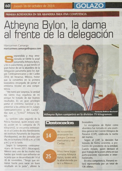 La cabo 2 de la Policía Nacional y reconocida boxeadora Atheyna Baylon fue escogida como la abanderada de la delegación panameña que competirá en los XXII Juegos Centroamericanos y del Caribe que se celebrarán desde el 15 de noviembre en Veracruz, México. Baylon por su disciplina, responsabilidad y entrega al deporte se ha convertido en una de las esperanzas del deporte nacional para lograr una medalla de oro en la competencia regional, en la que participarán atletas de 32 países, en 36 deportes programados para los Centroamericanos. El teniente Aparicio de la Policía Nacional presidente de la selección de Panamá, dijo que con tan solo 24 años de edad Atheyna se ha convertido en una de las mejores boxeadoras en su categoría las 75 kilos. Agregó que de los 18 combates, Baylon ha perdido dos y que la mayoría de las defensas las ha hecho fuera. En óptimas condiciones se encuentra la atleta, quién viajará junto a sus compañeros de trabajo el agente Luis Hernández, clasificado a nivel mundial, y el cabo 1 Melanio Flores, quienes representarán al país y a la institución de seguridad, en la disciplina boxística. ¡Felicidades a los atletas! |