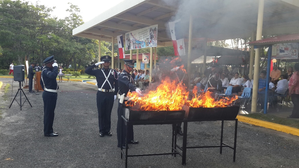 La Escolta de Bandera de la Segunda Zona Policial participó este 4 de noviembre, del solemne acto de cremación de banderas, actividad que todos los años realiza la Universidad Nacional de Panamá, extensión universitaria de Coclé y a la que asiste la Policía Nacional, para brindar a nuestra gloriosa bandera, el honor que se merece, como símbolo sagrado de nuestra nación. Todos los años, la Policía Nacional participa de esta actividad, como invitados de la Universidad Nacional, en este acto, donde se rinde honores a la bandera y se destruyen, de acuerdo al protocolo establecido, las banderas deterioradas, justamente el día dedicado a los símbolos patrios. En la actividad participan las autoridades universitarias, administrativas, estudiantes, así como algunas instituciones del estado, culminado el acto, se dirigen hacia Penonomé, para participar del desfile cívico del 4 de noviembre. |