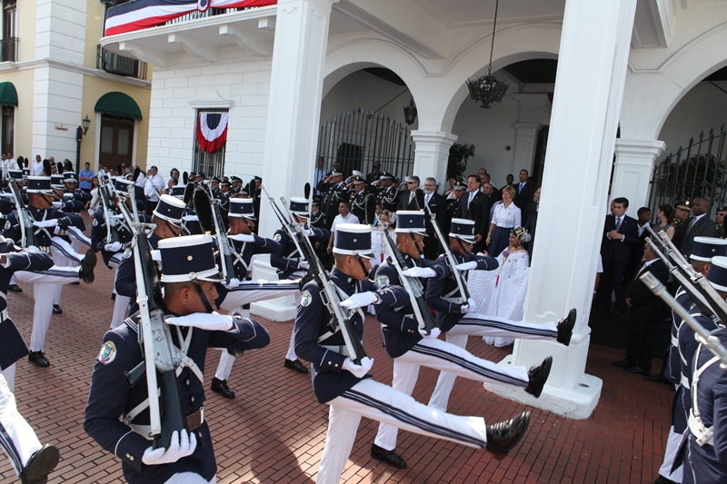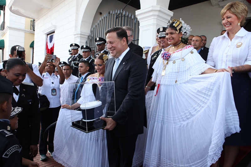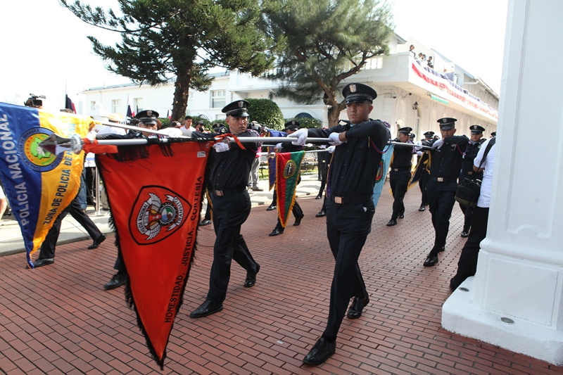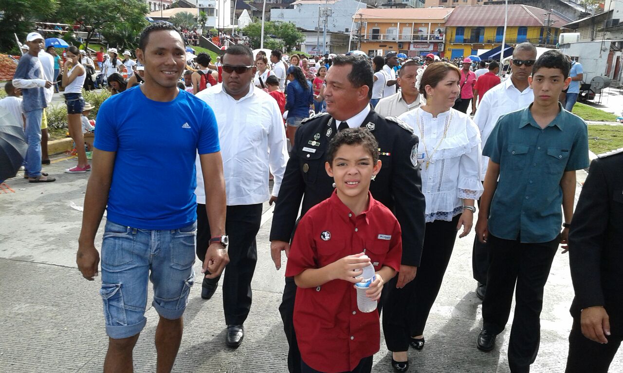 Con mucho donaire y amor por la Patria, uniformados de la Policía Nacional marcharon este martes 4 de noviembre, día de los Símbolos Patrios, durante el desfile que inició en los predios de la Presidencia de la República y continúo en la Cinta Costera. Luego de saludar con el respeto merecido a las autoridades que se encontraban el palco presidencial, esta delegación de policías encabezados por niños ataviados en sus uniformes policiales, le hicieron entrega al excelentísimo Presidente de la República, Juan Carlos Varela Rodríguez, de un sombrero penacho, que es utilizado por los cadetes del Centro de Enseñanza Superior Doctor Justo Arosemena. En el desfile, junto al mandatario de la República y su esposa la Primera Dama, Lorena Castillo de Varela, estuvo presente el director de la Policía Nacional, Omar Pinzón Marín junto a los miembros del Directorio Nacional Policial, quienes con orgullo se unieron al regocijo del público que aplaudió la vistosa presentación de la primera institución de seguridad. Horas más tarde, el director de la Policía Nacional, Omar Pinzón recorrió la ruta del desfile en la Cinta Costera para supervisar el buen desarrollo de este evento, en el que se desplegaron más de 3 mil efectivos policiales, que velaron por la seguridad y tranquilidad de nacionales y extranjeros que disfrutaron de la celebración patriótica.