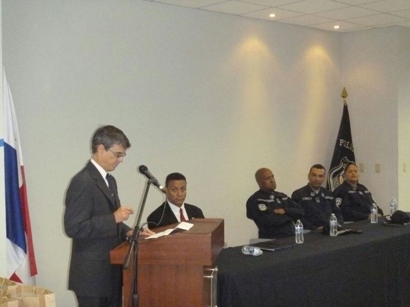Con el propósito de respaldar la labor que realiza Unidad Policial del Metro (UPM) de la Policía Nacional, la embajada de Estados Unidos en Panamá hizo una donación de equipos en un acto realizado en la Secretaria del Metro; esto como parte de los programas de cooperación internacional entre ambas naciones. En la ceremonia de entrega estuvieron presentes por parte de la Embajada de Estados Unidos el Ministro Consejero, Kevin O´ Reilly; Sean Sirker, jefe de la Oficina Regional de Seguridad; el licenciado Javier Hunt; entre otros funcionarios; mientras que por la Policía Nacional, los equipos fueron recibidos por el comisionado Javier González, jefe de la UPM, el subcomisionado Gabriel Medina, Director Nacional de Finanzas y la capitana Analena Panchano. El comisionado González agradeció a los funcionarios de la Embajada por esta donación, que incluye 50 zambrones, 80 linternas, 100 herramientas de emergencia, 14 alto parlantes y un equipo médico de resucitación, los cuales reforzarán la labor de vigilancia y seguridad a los nacionales y extranjeros que utilizan este sistema de transporte. Un aproximado de 91 efectivos policiales de la UPM han sido capacitados bajo la asesoría de la embajada de Los Estados Unidos para actuar y atender con rapidez y eficiencia cualquier situación. |