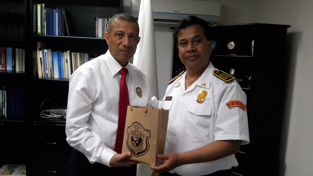 Una delegación de la Policía de Perú visitó esta mañana la sede de la Dirección de Investigación Judicial (DIJ) de la Policía Nacional, con la intensión de conocer sus funciones sobre la investigación y experiencias en materia de análisis criminal. El encuentro fue propicio para intercambiar experiencias sobre delitos comunes y tráfico internacional de drogas. Lo que dio lugar a estudiar la posibilidad de nuevas estrategias en materia de seguridad tanto por la Policía de Perú como por los investigadores de la Policía Nacional de Panamá. La presentación por parte de la DIJ estuvo a cargo de la mayor Oris Valdés y por el Ministerio Público (IMELCF), el licenciado Alejandro Prado. Una vez finalizada la reunión, el director de la DIJ, comisionado Marcos Córdoba, hizo entrega de obsequios a los cuatros oficiales que conforman la delegación de la Policía de Perú. Los policías hermanos del Perú, se reunieron también con los miembros de la Dirección Nacional Inteligencial Policial; la subcomisionada Elida Ortega, Directora Nacional de Bienestar Policial y Familiar y el subcomisionado Jorge Escobar, Director Nacional de Docencia. |