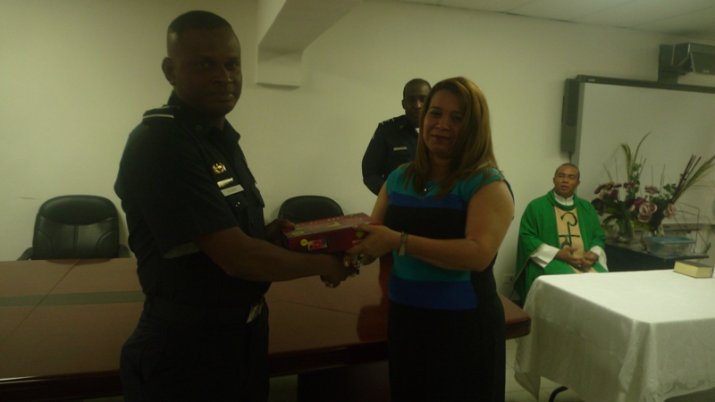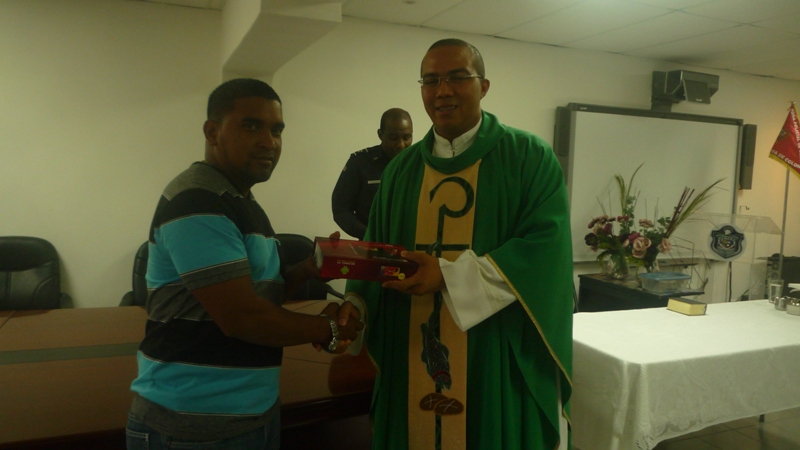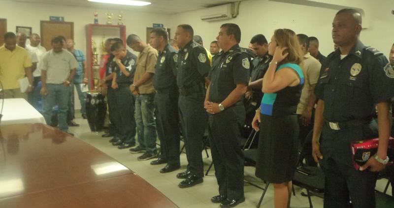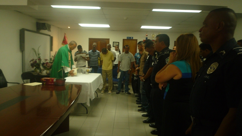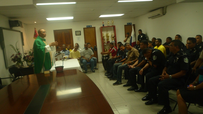 En la celebración de la misa que se realiza todos los miércoles en la zona policial de Colón, el comisionado Carlos Rumbo, aprovecho la oportunidad para resaltar a las unidades más sobresalientes en su trabajo en el mes de octubre. La misa fue auspiciada por el padre Ángel Pinilla, párroco de la zona policial, quien destaco en la homilía el trabajo sacrificado que realizan los miembros de la institución en beneficio de la comunidad. Al final de la misa se le entregó un obsequio al subteniente Edwin Lasso de servicio en el grupo de reacción rápida por ser el mayor capturador del mes de octubre y el cabo 1ro. Gabriel Quiroz, de la sección de la Narcóticos de la Dirección de Investigación Judicial. En la misa participó la gobernadora de la provincia Jenit Campo.