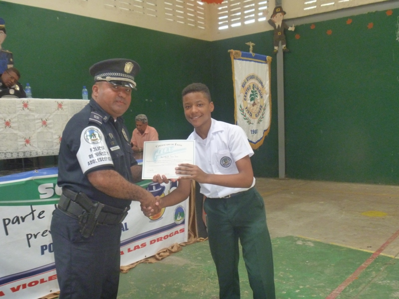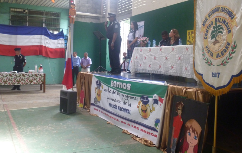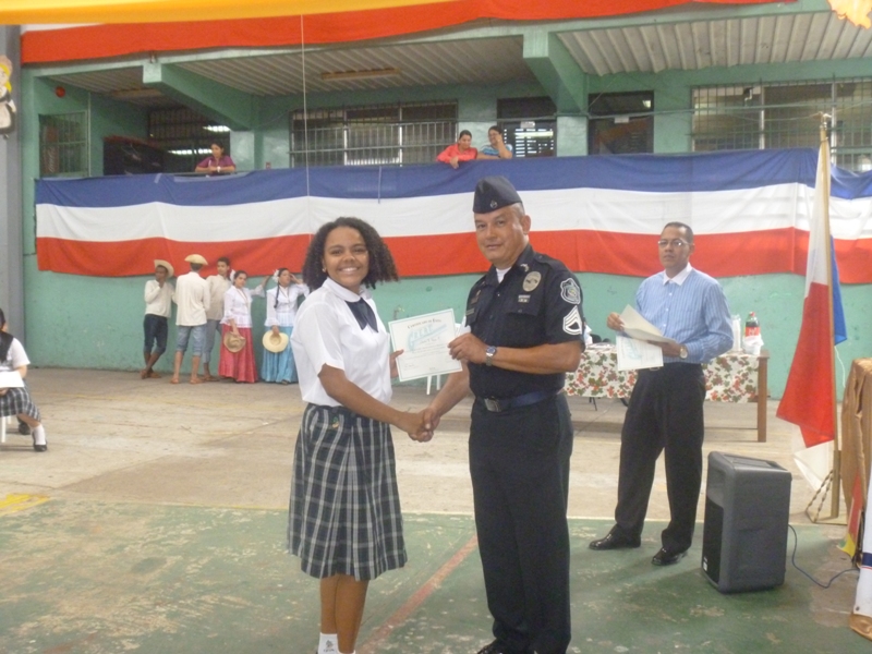 Unos 187 estudiantes del Centro Bilingüe Vista Alegre recibieron sus diplomas de culminación del programa de Educación y Entretenimiento en Resistencia a las Pandillas (G.R.E.A.T) La ceremonia de entrega de diplomas se realizó en horas de la mañana de este martes 25 de noviembre en la que participó el subcomisionado Luis Navarro, Jefe de la Zona de Policía de Arraiján. La directora del Centro educativo, Profesora Manuela Herrera y la niña Keylin Quijano del séptimo grado C agradecieron a la Policía Nacional por haber tomado en cuenta este plantel, para la implementación de este programa, el cual ha sido de gran beneficio para la población estudiantil. Dijo que los jóvenes pondrán en práctica los conocimientos adquiridos, a la vez, aprovecharan la oportunidad para solicitarle a la Policía de Niñez y Adolescencia se les tome en cuenta en la programación de 2015. El subcomisionado Luis Navarro felicitó a los participantes a quienes instó a poner en práctica los conocimientos aprehendidos durante seis semanas y a que sean agentes multiplicadores entre sus compañeros, amigos y vecinos. |