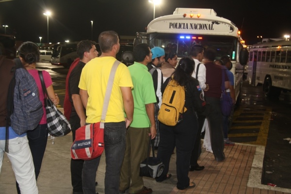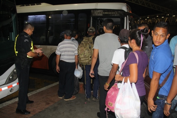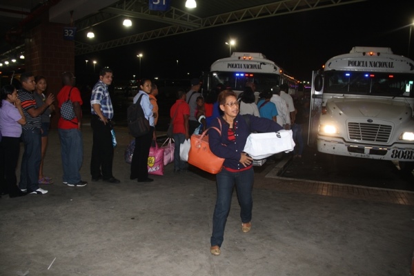 La Policía Nacional reafirmó su compromiso de “Proteger y Servir”, al colaborar con la movilización de cientos de personas que habían quedado varadas el pasado martes 25 de noviembre, en la terminal de buses de Albrook, tras dificultades en el transporte colectivo hacia el área oeste. A eso de las 11:00 de la noche, llegaron a la terminal de Albrook, los buses de la Dirección Nacional Transporte y Mantenimiento de la Policía Nacional, para prestar el servicio y llevar a las personas que esperaban un vehículo que los trasladará lo más cerca de sus hogares en diferentes puntos de La Chorrera y Arraiján. El Presidente de la República Juan Carlos Varela, envió unidades del Metrobús, para socorrer a los usuarios del transporte hacia el distrito de Arraiján que fue el más afectado por las fuertes lluvias registradas la tarde de este martes 25 de noviembre. La lluvia y el tranque no fue impedimento para que el primer mandatario Varela, acudiera al lugar, para brindarle respuesta a los usuarios, supervisando el traslado de pasajeros hacia el área Oeste de la Capital. La Policía Nacional es una institución pública al servicio de la comunidad y momentos como el ocurrido el pasado martes, está a la disposición de los panameños trabajadores que luego de una ardua jornada buscan llegar a sus hogares para descansar y estar con sus familia. |