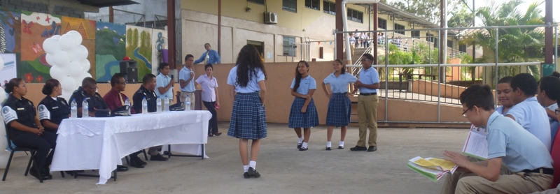 Con la dramatización de temas como el primer día de clases, el examen, noches de travesuras, la verdad sobre las pandillas y la violencia y la fiesta, 150 alumnos de la Academia Panamá Heigts Internacional del distrito de Arraiján finalizaron el programa de Educación y Entrenamiento en Resistencia a las Pandillas (GREAT). El acto de graduación realizado éste jueves 27 de noviembre en el gimnasio del plantel fue presidido por el subcomisionado Luis Navarro quien al hacer uso de la palabra felicitó a los participantes, ya que, con sus presentaciones demostraron haber adquiridos los conocimientos impartidos por el facilitador Sargento 1ero. José Ripamonte. Los estudiantes de los niveles de cuarto, quinto, sexto, séptimo y octavo grado se mostraron alegres y expresaron su agradecimiento a la Policía Nacional, la oportunidad que les brindó al impartirles este programa. |