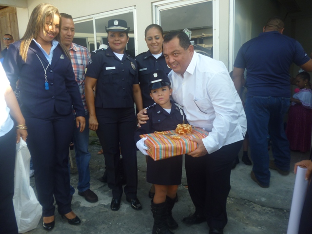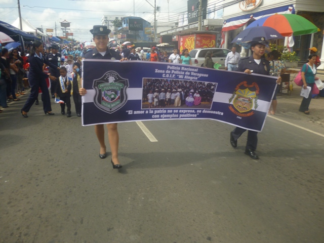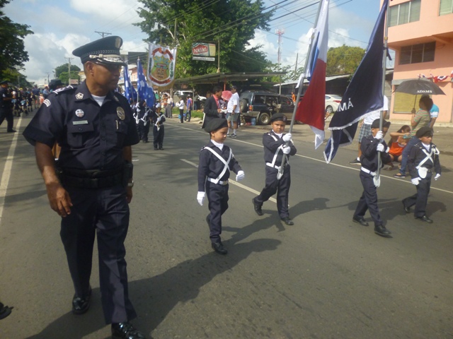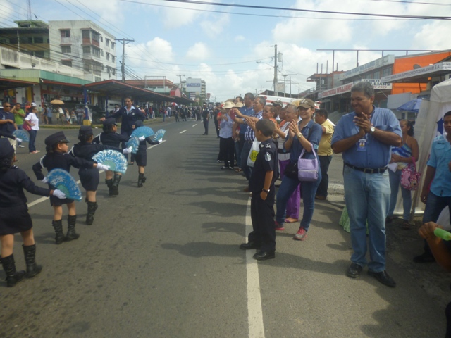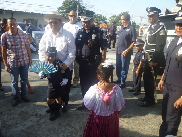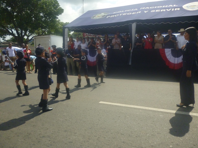 Más de 45 niños acompañados de los profesores, padres de familia y del comisionado Gilberto Cuevas jefe de la zona de policía de Veraguas, formaron parte de la delegación que represento dignamente el Coif "Mi Alegría" de la Policía Nacional, ubicado en la provincia de Veraguas. A lo largo de la ruta del desfile se hacía evidente los aplausos que recibían las batuteras, escoltas, empolleradas y batallón, quienes se lucieron en su presentación como delegación, invitada para los desfiles del 28 de noviembre que se realizaron este 30 de noviembre en el distrito de La Chorrera. El personal docente y administrativo hizo entrega de un obsequio al director General de la Policía Nacional el Comisionado Omar Pinzón, en agradecimiento por el apoyo dado a este plantel educativito. |