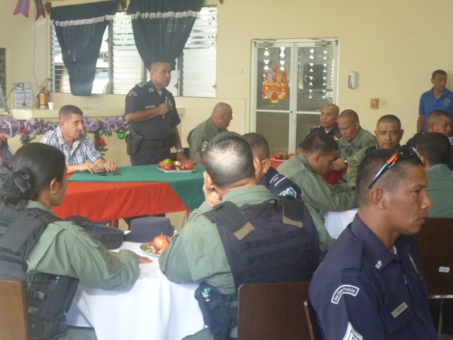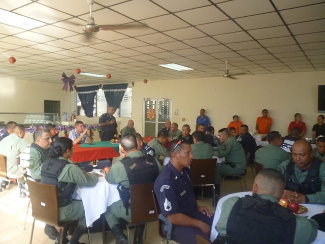 Con una cena en vísperas de año nuevo, en las instalaciones de la Zona de Policía de Veraguas, compartieron en la tarde del 31 de diciembre más de 280 estudiantes de la Ispol-extención Veraguas y unidades policiales, que iniciaban sus labores de trabajo. El jefe de la Zona de Policía de Veraguas, el Comisionado Gilberto Cuevas agradeció a las unidades policiales por el trabajo realizado este 2014, les exhortó a continuar con la eficiencia y eficacia que demuestran al realizar sus labores. Dijo que ese trabajo que realizan en conjunto con las autoridades y la ciudadanía, son los que mantienen a Veraguas como una de las provincias más segura del país. |