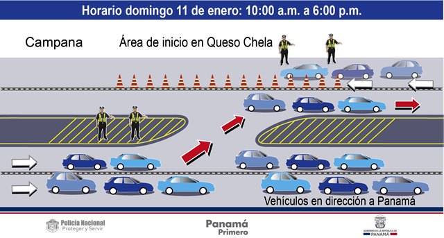La Dirección Nacional de Operaciones de Tránsito de la Policía Nacional, informa a la ciudadanía que con el inicio del operativo “Verano Seguro” comienza la inversión de carriles todos los domingos, desde Quesos Chela hasta La Espiga de La Chorrera. Durante los fines de semana normales, la inversión será en un horario de 2:00 p.m. a 6:00 p.m. y en aquellos fines de semanas largos, la regulación es desde las 10:00 a.m. hasta las 6:00 p.m. |
