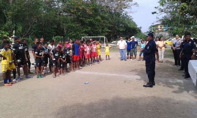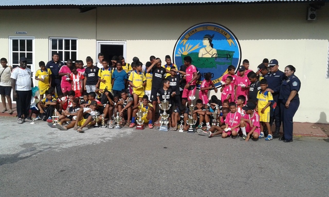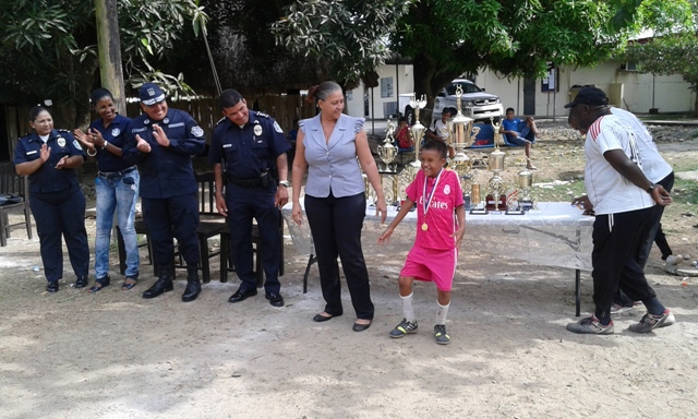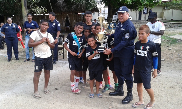 Unidades policiales de la 5ta Zona Policial de Panama Este, culminaron el III campeonato de fútbol "Verano Feliz 2015", el cual se realizó en el campo de juegos de esta zona policial, del 14 de enero al 6 de febrero del año en curso. Este evento coordinado y dirigido por los departamentos de Seguridad Ciudadana, Trabajo Social y Policia de Niñez y Adolescencia, contó con la participacion de 150 niños y adolescentes, entre las edades de 7 y 17 años, de los diferentes sectores de chepo (tanara, las margaritas, primavera, higuera, loma del rio, santa isabel y union de azuero). Este campeonato de futbol se dividio en dos categorias , sub-13 y sub-17, cada categoria contando con la participacion de seis equipos, representando valores como la amistad, dignidad, tolerancia, responsabilidad, generosidad, honestidad, honor, respeto, humildad, cortesia, honradez y valor, quedando campeon el equipo de honor en la categoria sub 13 y del equipo de generosidad en la categoria sub-17. El cmisionado Luis Álvarez, en sus palabras de clausura del evento, exhortó a estos jóvenes a seguir cultivando cada uno de los valores que representaron, lo que los ayudará en un futuro a ser mejores personas , miembros de la comunidad de chepo. |