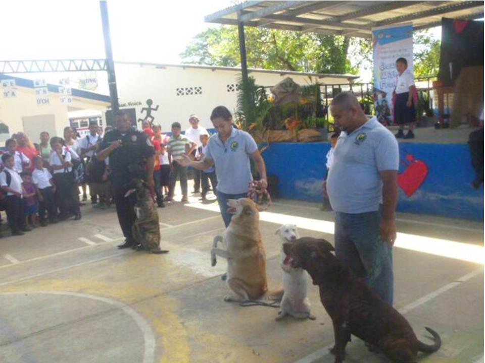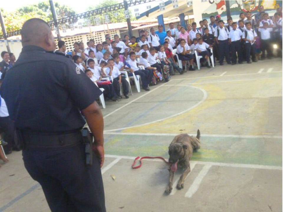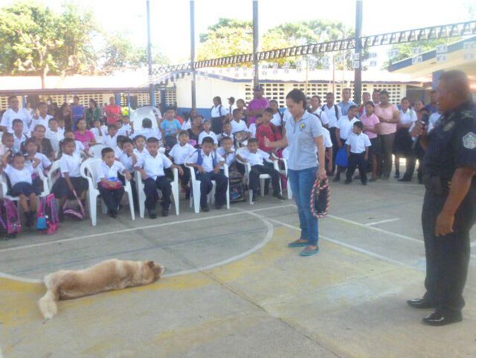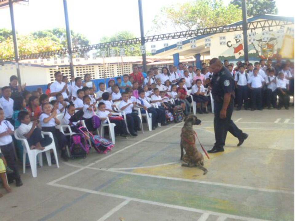 Unidades de la Oficina de Seguridad Ciudadana en Bocas del Toro organizaron un evento en el Centro de Educación Básica General del Empalme en Changuinola, donde partició el Grupo Juvenil Canino (GRUJUCAN) con una presentación canina para motivar a los jóvenes a unirse. En la actividad participaron más de 100 niños y niñas quienes son estudiantes de nivel primario. Al finalizar, los educadores presentes y los estudiantes mostraron actitudes de alegría e interés por aprender sobre sus propios canes en especial al cuidado y entrenamientos de obediencia. |