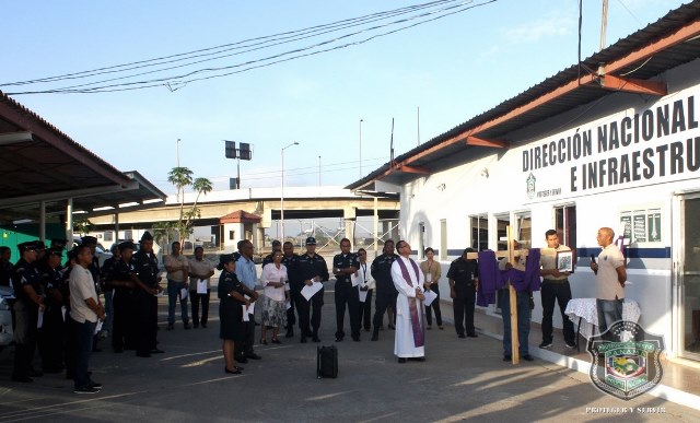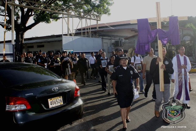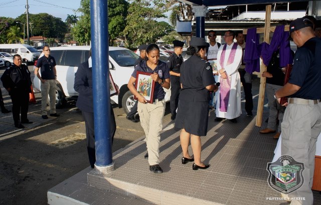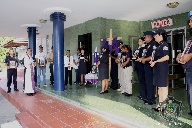 Con el mismo fervor y devoción con el que iniciaron el día uno, los uniformados realizaron su tercer viernes de “Vía Crucis” en la sede principal de la Policía Nacional en el corregimiento de Ancón, de camino a la celebración de la Semana Mayor. Las 15 estaciones fueron establecidas, nuevamente, en diferentes sitios de la sede policial, ubicada en el corregimiento de Ancón, éste viernes 20 de marzo. Cada una de las estaciones destaca el recorrido que hiciera Jesús de camino hacia el lugar de su crucifixión y muerte. Dicho camino se representa mediante 15 imágenes de la Pasión que se llaman "estaciones". 1ª Estación: Jesús sentenciado a muerte 2ª Estación: Jesús cargado con la cruz 3ª Estación: Jesús cae, por primera vez, bajo el peso de la cruz 4ª Estación: encuentro con la virgen 5ª Estación: el cirineo ayuda al señor a llevar la cruz 6ª Estación: la verónica enjuga el rostro de Jesús 7ª Estación: segunda caída en el camino de la cruz 8ª Estación: Jesús consuela a las hijas de Jerusalén 9ª Estación: Jesús cae por tercera vez 10ªEestación: Jesús despojado de sus vestiduras 11ª Estación: Jesús clavado en la cruz 12ª Estación: Jesús muere en la cruz 13ª Estación: Jesús en brazos de su madre 14ª Estación: el cadáver de Jesús puesto en el sepulcro 15ª Estación: Jesús resucita En la actividad estuvo el Director de la Policía Nacional, Omar Ariel Pinzón Marín, miembros de su directorio, unidades policiales y miembros no juramentados que laboran en la primera institución de seguridad pública de Panamá, animándose los unos a los otros a cargar con su cruz día a día, de la manera como Jesús les dijera a sus discípulos en el libro de San Mateo 16:24: “Si alguno quiere venir en pos de mí, niéguese a sí mismo, tome su cruz y sígame”. |