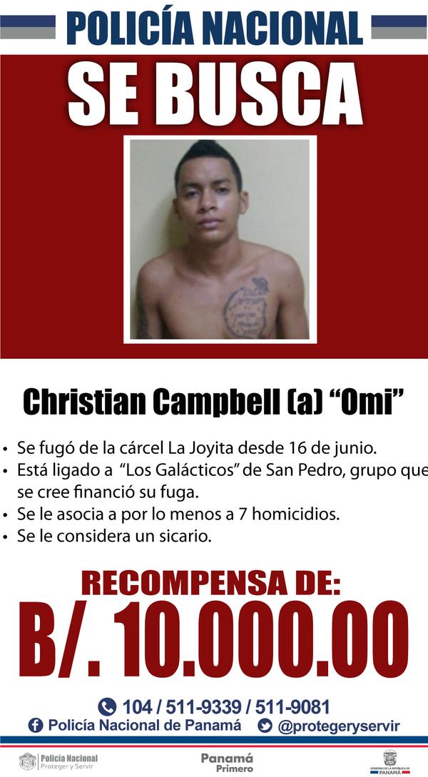 Jueves, 03 de septiembre de 2015 a las 7:50 am La Policía Nacional continúa la búsqueda de los dos prófugos: Christian Campbell, alias "Omi", y Rafael Salinas, alias "Ito", prófugos de La Joyita desde el mes de junio...