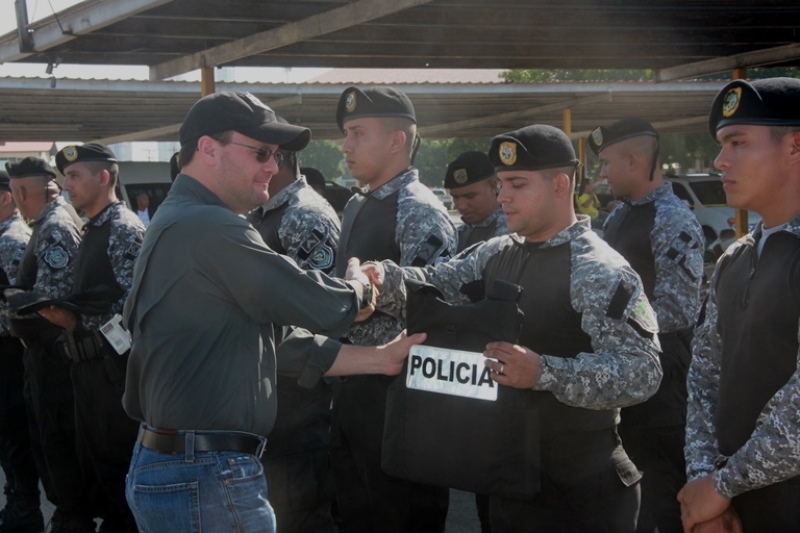Viernes, 03 de enero de 2014 a las 3:00 pm Unidades del Grupo Motorizado Linces, recibieron de manos del Director de la Policía Nacional Julio Moltó un nuevo equipo de trabajo consistente en chalecos antibalas.. |