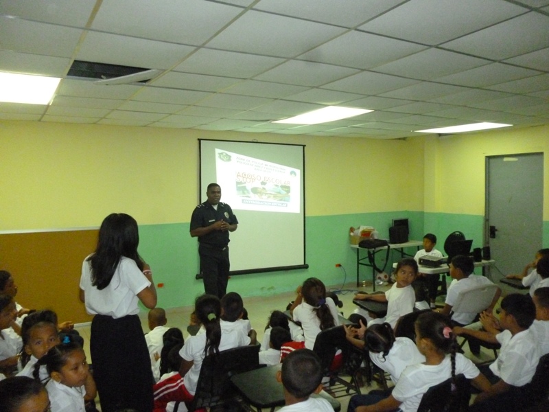 Lunes, 12 de agosto de 2013 a las 11:34 am La Zona de Policía de Colón a través de la Policía de Niñez y Adolescencia para prevenir el abuso escolar o el llamado bullying dictó una chala a estudiantes de escuelas primarias del plantel Santa Rita Arriba ubicada en la comunidad del mismo nombre en el corregimiento de Sabanitas. |