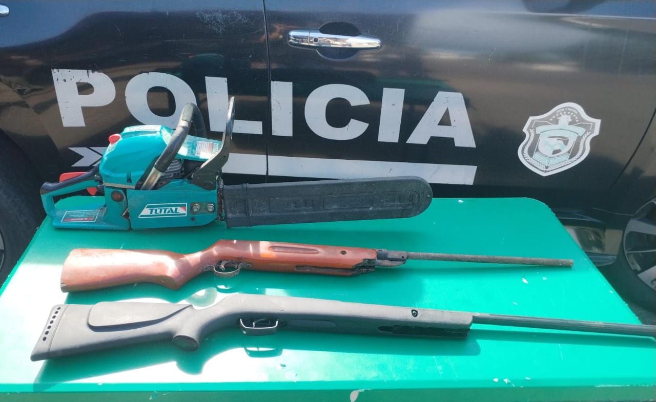 DOS APREHENDIDOS, EL DECOMISO DE RÉPLICAS DE RIFLES, MOTOSIERRA Y PRESUNTA DROGA EN GAMBOA
